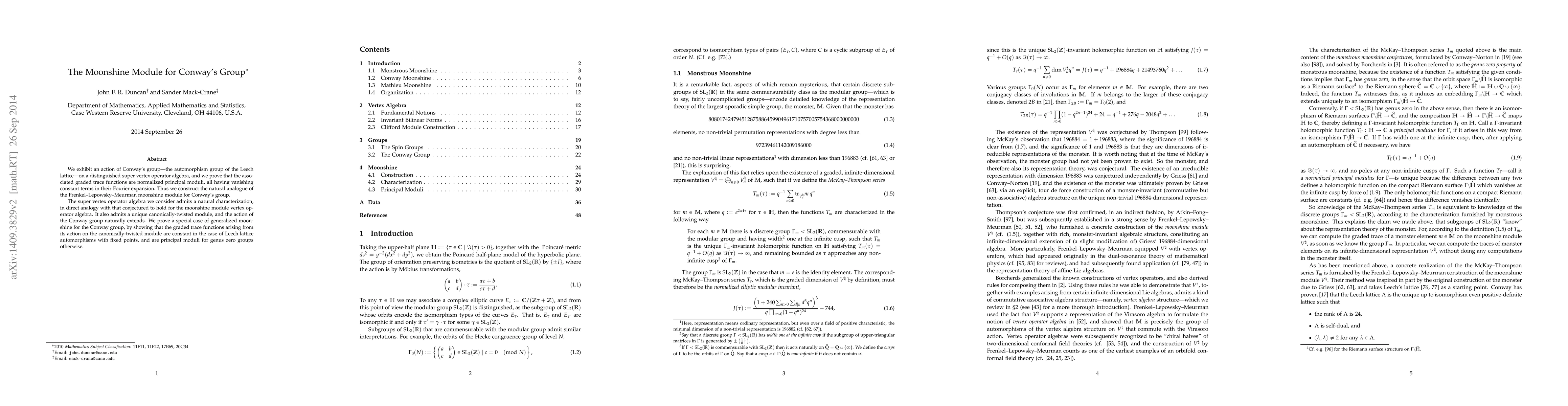 This paper constructs the moonshine module for Conway's group, demonstrating its action on a super vertex operator algebra and proving that its graded trace functions are normalized principal moduli. The study also proves a special case of generalized moonshine, showing constant trace functions for certain automorphisms and principal moduli for others.
