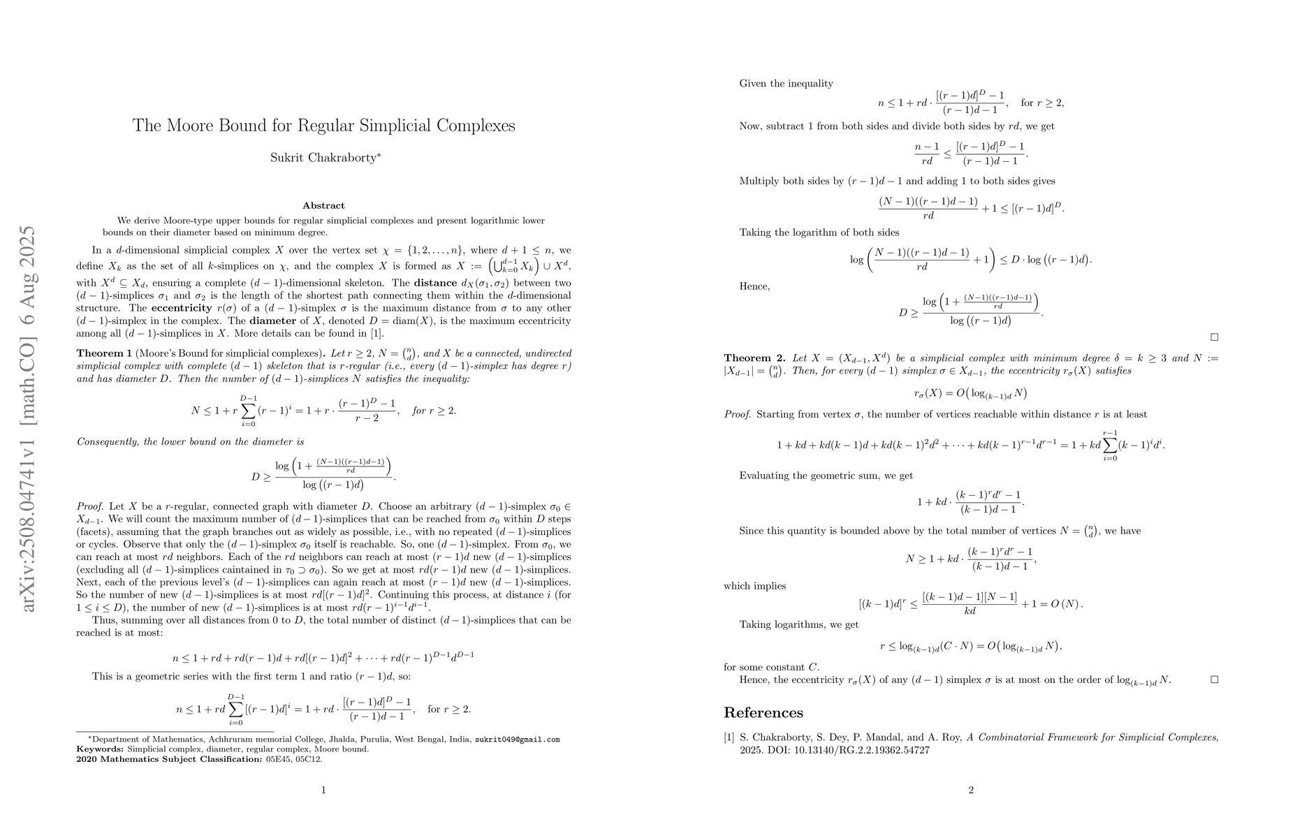 We derive Moore-type upper bounds for regular simplicial complexes and present logarithmic lower bounds on their diameter based on minimum degree.