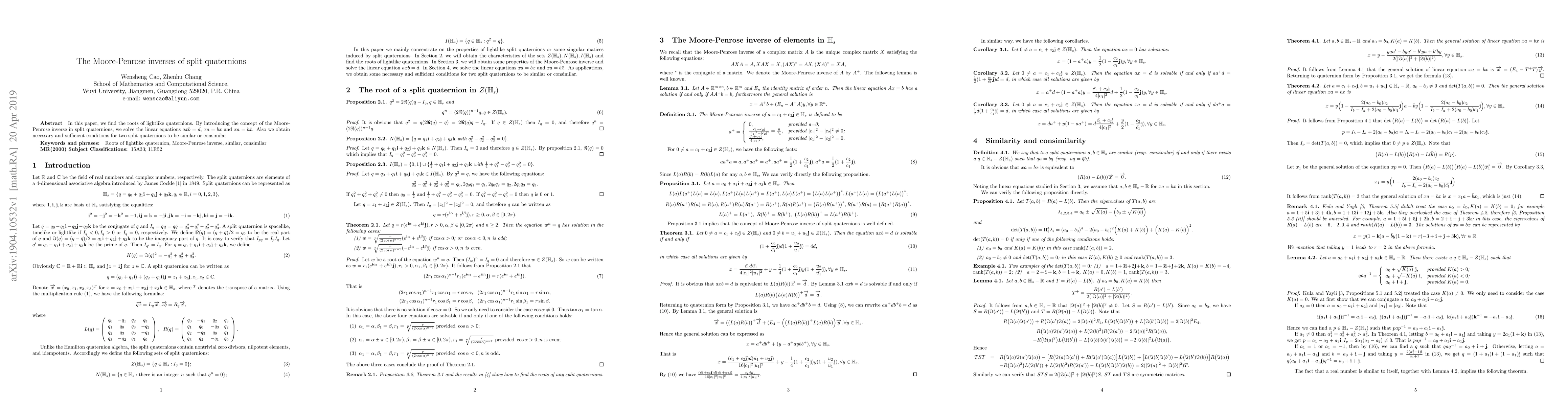 This paper explores the Moore-Penrose inverses in split quaternions to determine roots of lightlike quaternions and solve linear equations. It also establishes conditions for similarity and consimilarity of split quaternions.