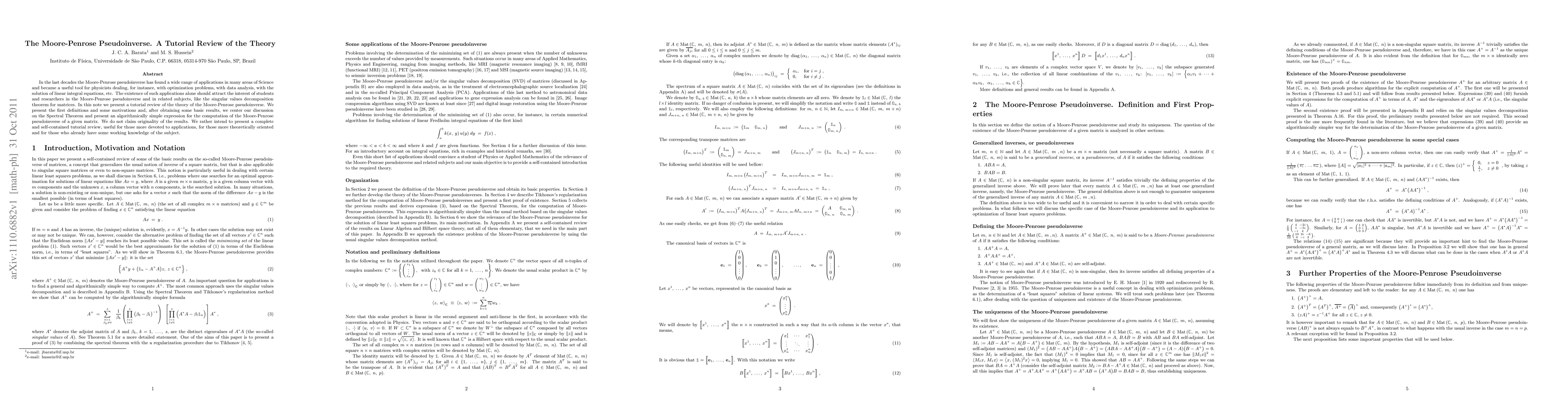 In the last decades the Moore-Penrose pseudoinverse has found a wide range of applications in many areas of Science and became a useful tool for physicists dealing, for instance, with optimization problems, with data analysis, with the solution of linear integral equations, etc. The existence of such applications alone should attract the interest of students and researchers in the Moore-Penrose pseudoinverse and in related sub jects, like the singular values decomposition theorem for matrices. In this note we present a tutorial review of the theory of the Moore-Penrose pseudoinverse. We present the first definitions and some motivations and, after obtaining some basic results, we center our discussion on the Spectral Theorem and present an algorithmically simple expression for the computation of the Moore-Penrose pseudoinverse of a given matrix. We do not claim originality of the results. We rather intend to present a complete and self-contained tutorial review, useful for those more devoted to applications, for those more theoretically oriented and for those who already have some working knowledge of the sub ject.
