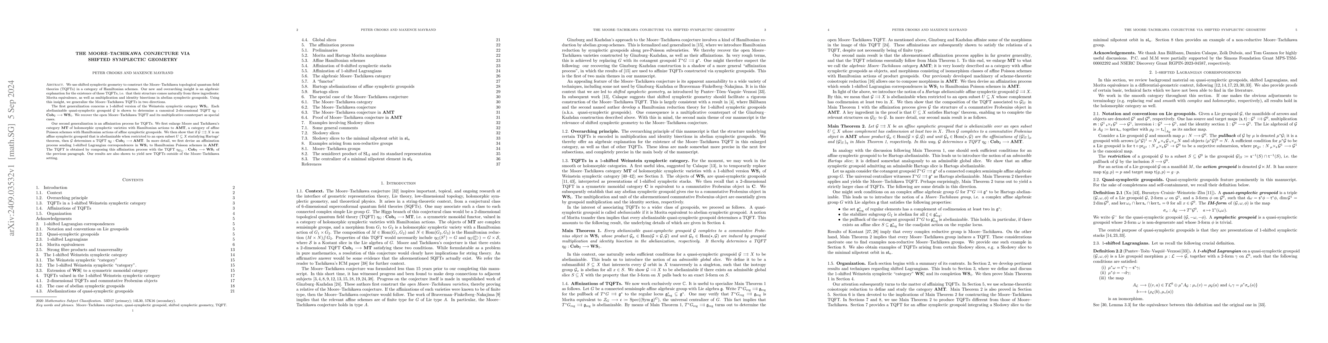 We use shifted symplectic geometry to construct the Moore-Tachikawa topological quantum field theories (TQFTs) in a category of Hamiltonian schemes. Our new and overarching insight is an algebraic explanation for the existence of these TQFTs, i.e. that their structure comes naturally from three ingredients: Morita equivalence, as well as multiplication and identity bisections in abelian symplectic groupoids. Using this insight, we generalize the Moore-Tachikawa TQFTs in two directions. The first generalization concerns a 1-shifted version of the Weinstein symplectic category $\mathbf{WS}_1$. Each abelianizable quasi-symplectic groupoid $\mathcal{G}$ is shown to determine a canonical 2-dimensional TQFT $\eta_{\mathcal{G}}:\mathbf{Cob}_2\longrightarrow\mathbf{WS}_1$. We recover the open Moore-Tachikawa TQFT and its multiplicative counterpart as special cases. Our second generalization is an affinization process for TQFTs. We first enlarge Moore and Tachikawa's category $\mathbf{MT}$ of holomorphic symplectic varieties with Hamiltonian actions to $\mathbf{AMT}$, a category of affine Poisson schemes with Hamiltonian actions of affine symplectic groupoids. We then show that if $\mathcal{G} \rightrightarrows X$ is an affine symplectic groupoid that is abelianizable when restricted to an open subset $U \subseteq X$ statisfying Hartogs' theorem, then $\mathcal{G}$ determines a TQFT $\eta_{\mathcal{G}} : \mathbf{Cob}_2 \longrightarrow \mathbf{AMT}$. In more detail, we first devise an affinization process sending 1-shifted Lagrangian correspondences in $\mathbf{WS}_1$ to Hamiltonian Poisson schemes in $\mathbf{AMT}$. The TQFT is obtained by composing this affinization process with the TQFT $\eta_{\mathcal{G}|_U} : \mathbf{Cob}_2 \longrightarrow \mathbf{WS}_1$ of the previous paragraph. Our results are also shown to yield new TQFTs outside of the Moore-Tachikawa setting.