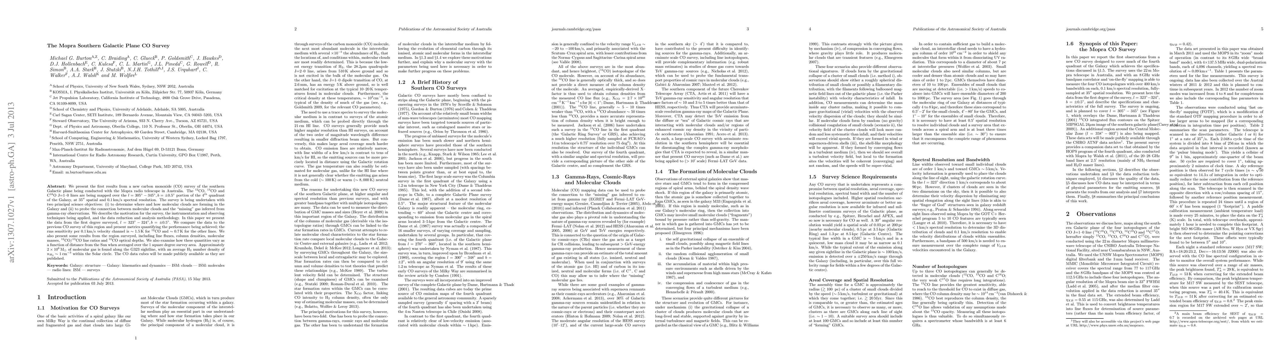This paper reports initial findings from a CO survey of the southern Galactic plane using the Mopra telescope, focusing on the 4th quadrant. The survey aims to identify molecular cloud formation sites and investigate the "missing" gas in the galaxy. Preliminary results show high-resolution data with rms sensitivities of ~1.5K for 12CO and ~0.7K for other lines, revealing approximately 2 x 10^6 M☉ of molecular gas with an average H2 density of ~1 cm-3.