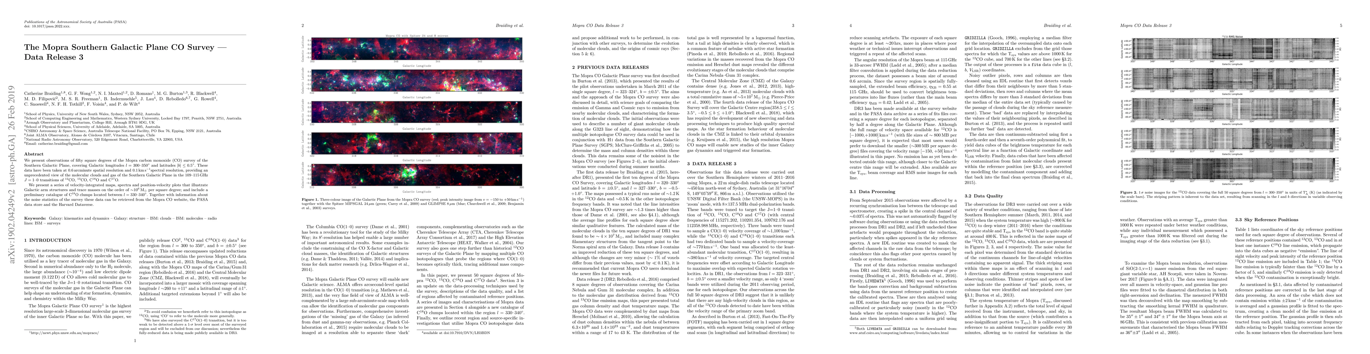 This paper presents high-resolution CO survey data from the Mopra telescope covering 50 square degrees of the Southern Galactic Plane, revealing detailed structures of molecular clouds and gas. The data includes velocity-integrated maps and spectra, highlighting Galactic arm structures and masses around $10^6$ M$_{\odot}$ per square degree, along with a preliminary catalogue of C$^{18}$O clumps.