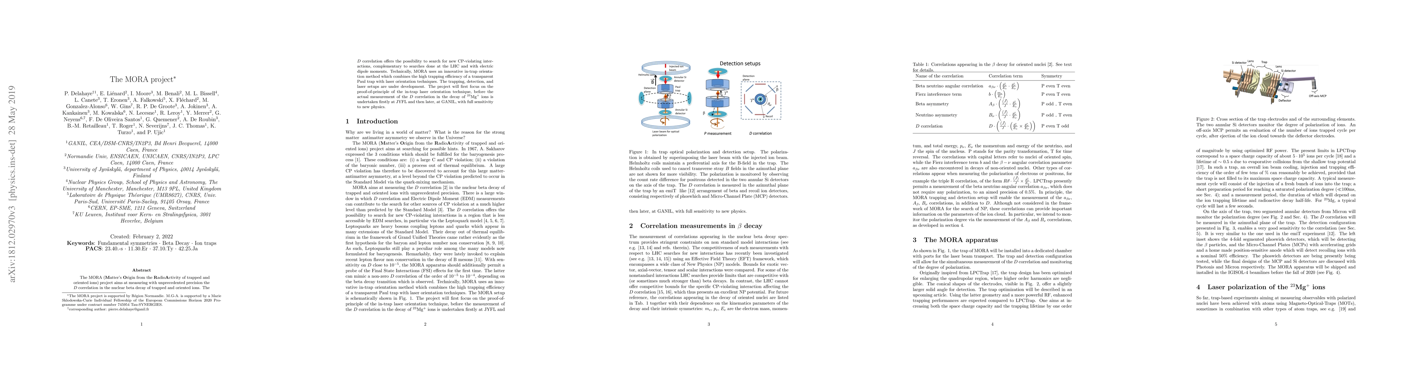 The MORA (Matter's Origin from the RadioActivity of trapped and oriented ions) project aims at measuring with unprecedented precision the D correlation in the nuclear beta decay of trapped and oriented ions. The D correlation offers the possibility to search for new CP-violating interactions, complementary to searches done at the LHC and with Electric Dipole Moments. Technically, MORA uses an innovative in-trap orientation method which combines the high trapping efficiency of a transparent Paul trap with laser orientation techniques. The trapping, detection, and laser setups are under development, for first tests at the Accelerator laboratory, JYFL, in the coming years.