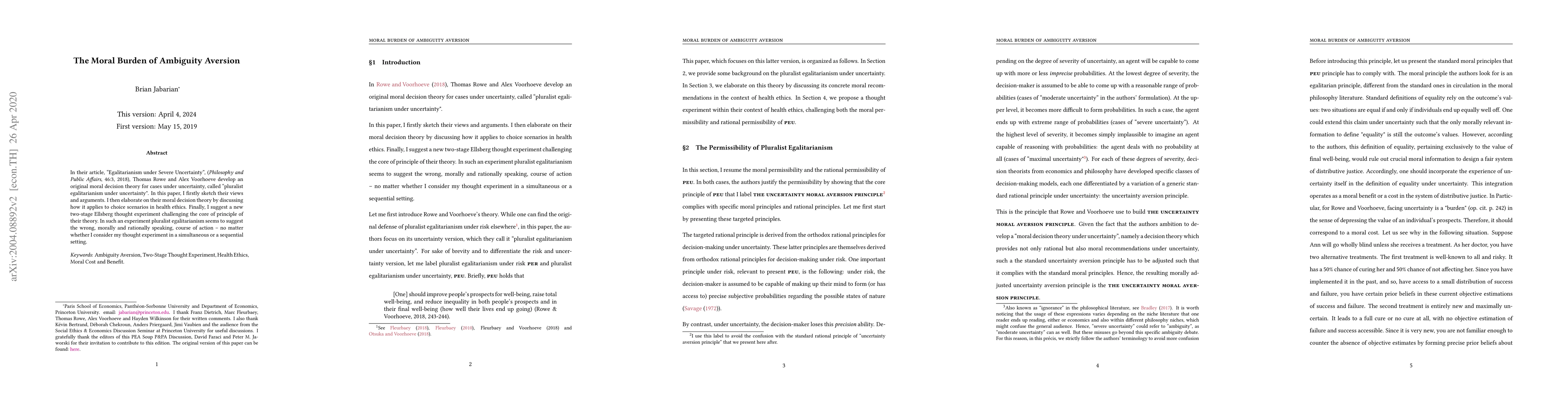 In their article, "Egalitarianism under Severe Uncertainty", Philosophy and Public Affairs, 46:3, 2018, Thomas Rowe and Alex Voorhoeve develop an original moral decision theory for cases under uncertainty, called "pluralist egalitarianism under uncertainty". In this paper, I firstly sketch their views and arguments. I then elaborate on their moral decision theory by discussing how it applies to choice scenarios in health ethics. Finally, I suggest a new two-stage Ellsberg thought experiment challenging the core of the principle of their theory. In such an experiment pluralist egalitarianism seems to suggest the wrong, morally and rationally speaking, course of action -- no matter whether I consider my thought experiment in a simultaneous or a sequential setting.