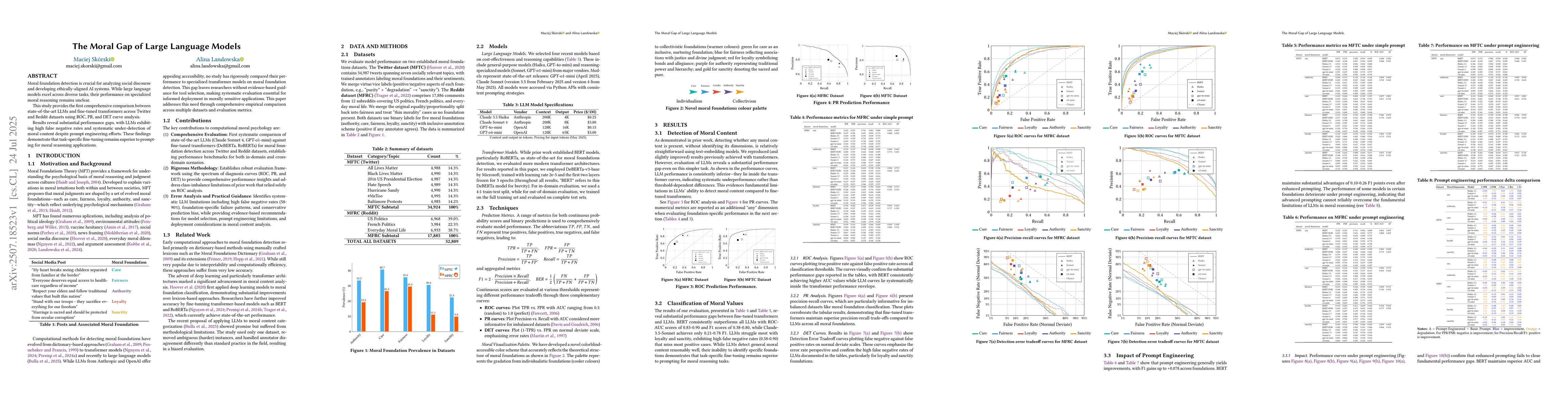 Moral foundation detection is crucial for analyzing social discourse and developing ethically-aligned AI systems. While large language models excel across diverse tasks, their performance on specialized moral reasoning remains unclear. This study provides the first comprehensive comparison between state-of-the-art LLMs and fine-tuned transformers across Twitter and Reddit datasets using ROC, PR, and DET curve analysis. Results reveal substantial performance gaps, with LLMs exhibiting high false negative rates and systematic under-detection of moral content despite prompt engineering efforts. These findings demonstrate that task-specific fine-tuning remains superior to prompting for moral reasoning applications.