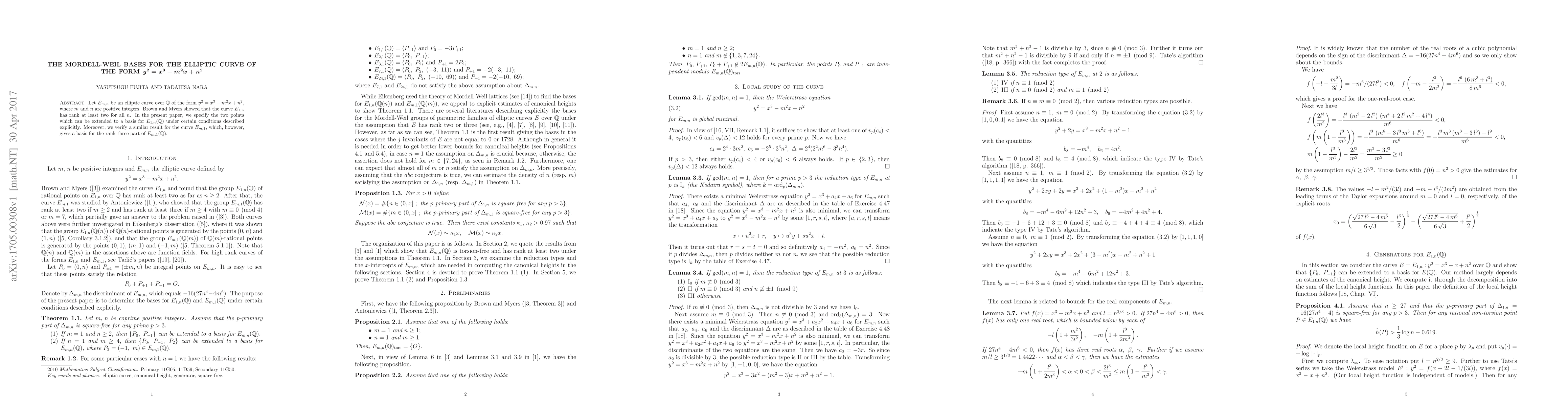 This paper identifies specific points on elliptic curves of the form $y^2 = x^3 - m^2x + n^2$ that can form Mordell-Weil bases, particularly for $E_{1,n}$ and $E_{m,1}$, under certain conditions, extending the rank results shown by Brown and Myers.