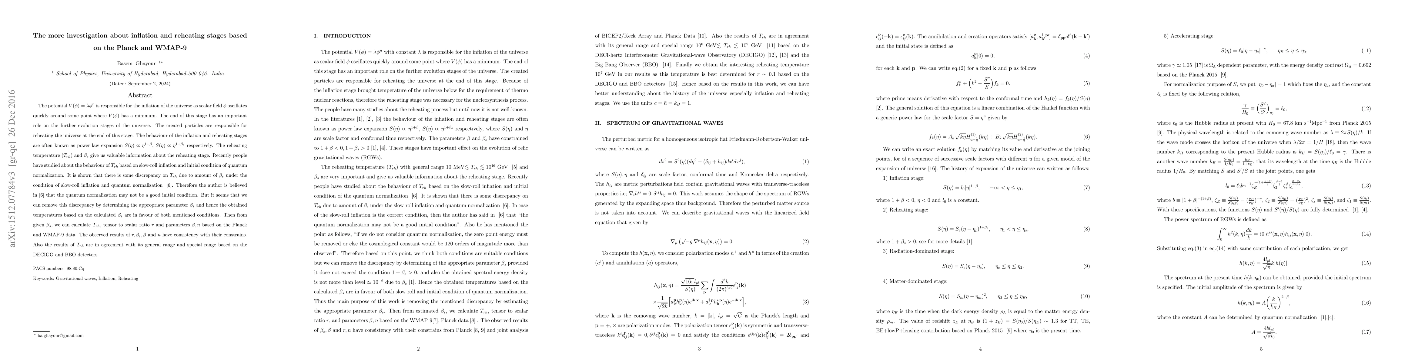 The potential $V(\phi)=\lambda \phi^{n}$ is responsible for the inflation of the universe as scalar field $\phi$ oscillates quickly around some point where $V(\phi)$ has a minimum. The end of this stage has an important role on the further evolution stages of the universe. The created particles are responsible for reheating the universe at the end of this stage. The behaviour of the inflation and reheating stages are often known as power law expansion $S(\eta) \varpropto \eta^{1+\beta}$, $S(\eta) \varpropto \eta^{1+\beta_{s}}$ respectively. The reheating temperature ($T_{rh}$) and $\beta_{s}$ give us valuable information about the reheating stage. Recently people have studied about the behaviour of $T_{rh}$ based on slow-roll inflation and initial condition of quantum normalization. It is shown that there is some discrepancy on $T_{rh}$ due to amount of $\beta_{s}$ under the condition of slow-roll inflation and quantum normalization \cite{acq}. Therefore the author is believed in \cite{acq} that the quantum normalization may not be a good initial condition. But it seems that we can remove this discrepancy by determining the appropriate parameter $\beta_{s}$ and hence the obtained temperatures based on the calculated $\beta_{s}$ are in favour of both mentioned conditions. Then from given $\beta_{s}$, we can calculate $T_{rh}$, tensor to scalar ratio $r$ and parameters $\beta, n$ based on the Planck and WMAP-9 data. The observed results of $r, \beta_{s}, \beta$ and $n$ have consistency with their constrains. Also the results of $T_{rh}$ are in agreement with its general range and special range based on the DECIGO and BBO detectors.