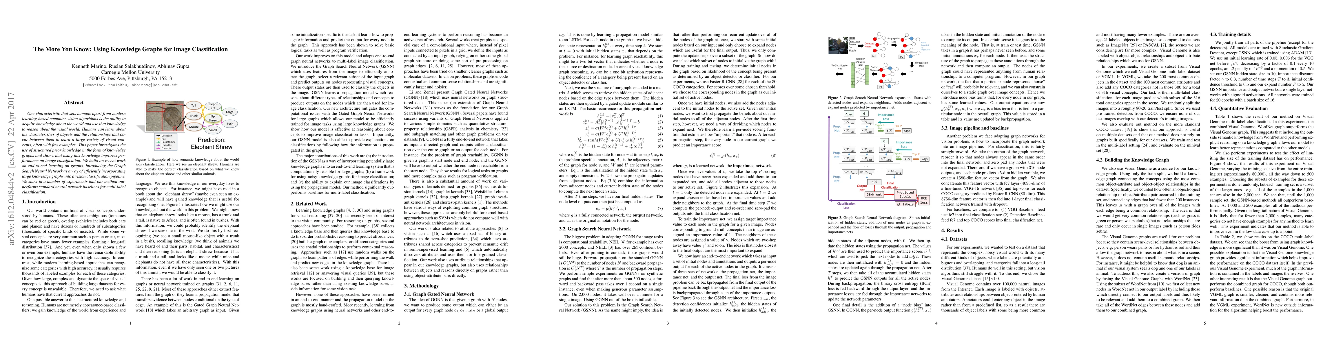 One characteristic that sets humans apart from modern learning-based computer vision algorithms is the ability to acquire knowledge about the world and use that knowledge to reason about the visual world. Humans can learn about the characteristics of objects and the relationships that occur between them to learn a large variety of visual concepts, often with few examples. This paper investigates the use of structured prior knowledge in the form of knowledge graphs and shows that using this knowledge improves performance on image classification. We build on recent work on end-to-end learning on graphs, introducing the Graph Search Neural Network as a way of efficiently incorporating large knowledge graphs into a vision classification pipeline. We show in a number of experiments that our method outperforms standard neural network baselines for multi-label classification.