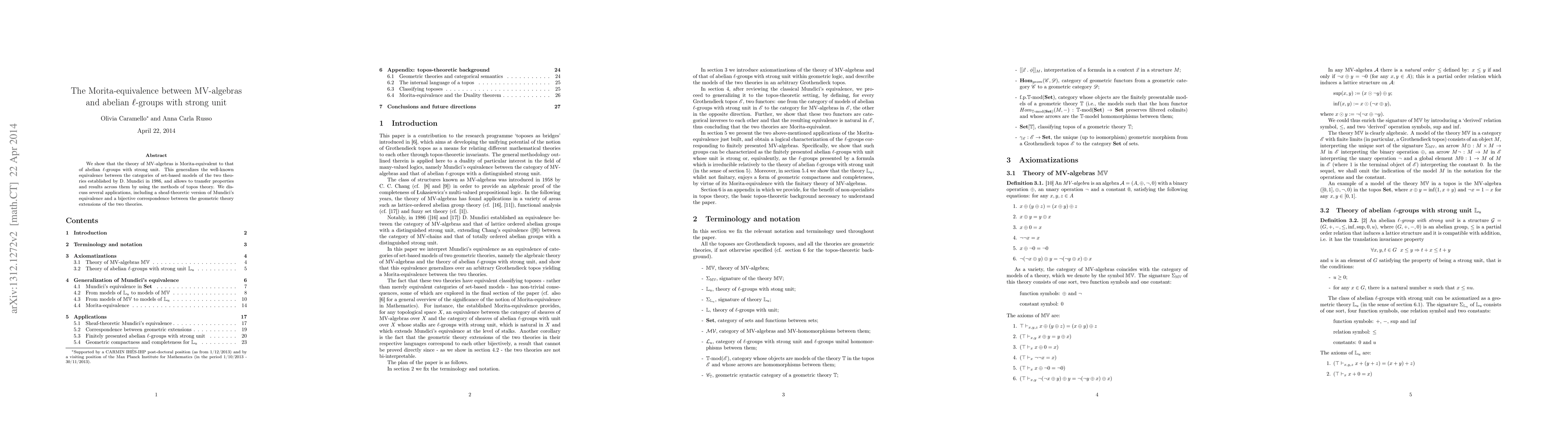 The theory of MV-algebras is shown to be Morita-equivalent to that of abelian $ au$-groups with strong unit, enabling the transfer of properties between them through topological methods.