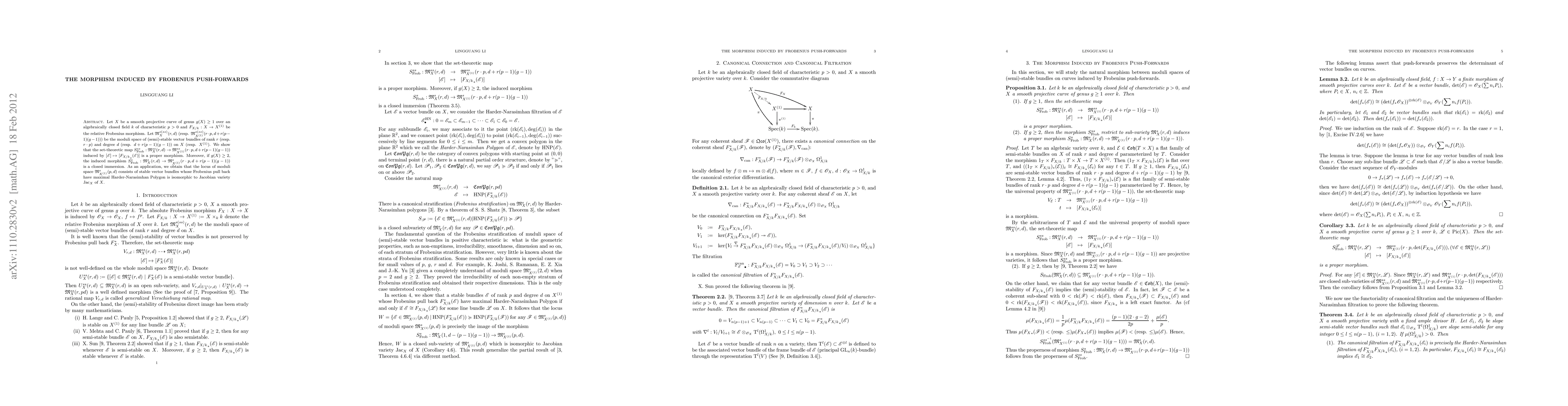 Let $X$ be a smooth projective curve of genus $g(X)\geq 1$ over an algebraically closed field $k$ of characteristic $p>0$ and $F_{X/k}:X\rightarrow X^{(1)}$ be the relative Frobenius morphism. Let $\mathfrak{M}^{s(ss)}_X(r,d)$ (resp. $\mathfrak{M}^{s(ss)}_{X^{(1)}}(r\cdot p,d+r(p-1)(g-1))$) be the moduli space of (semi)-stable vector bundles of rank $r$ (resp. $r\cdot p$) and degree $d$ (resp. $d+r(p-1)(g-1)$) on $X$ (resp. $X^{(1)}$). We show that the set-theoretic map $S^{ss}_{\mathrm{Frob}}:\mathfrak{M}^{ss}_X(r,d)\rightarrow\mathfrak{M}^{ss}_{X^{(1)}}(r\cdot p,d+r(p-1)(g-1))$ induced by $[\E]\mapsto[{F_{X/k}}_*(\E)]$ is a proper morphism. Moreover, if $g(X)\geq 2$, the induced morphism $S^s_{\mathrm{Frob}}:\mathfrak{M}^s_X(r,d)\rightarrow\mathfrak{M}^s_{X^{(1)}}(r\cdot p,d+r(p-1)(g-1))$ is a closed immersion. As an application, we obtain that the locus of moduli space $\mathfrak{M}^{s}_{X^{(1)}}(p,d)$ consists of stable vector bundles whose Frobenius pull back have maximal Harder-Narasimhan Polygon is isomorphic to Jacobian variety $\Jac_X$ of $X$.