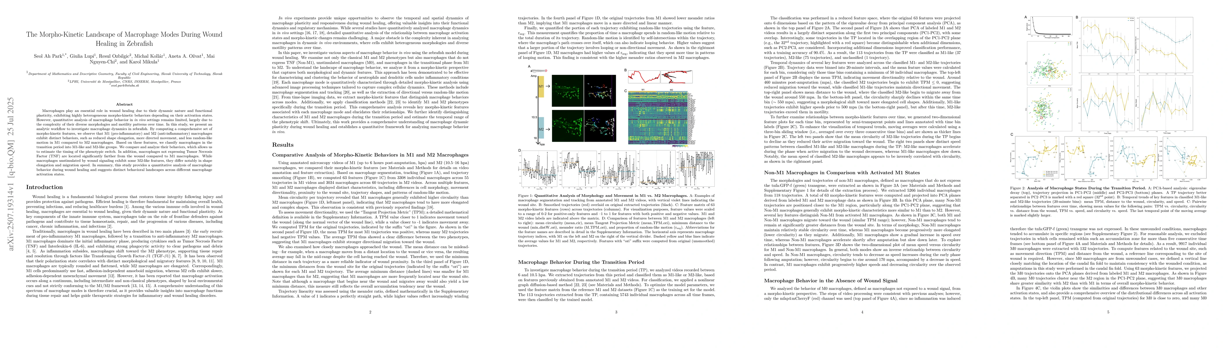 Macrophages play an essential role in wound healing due to their dynamic nature and functional plasticity, exhibiting highly heterogeneous morpho-kinetic behaviors depending on their activation states. However, quantitative analysis of macrophage behavior in in vivo settings remains limited, largely due to the complexity of their diverse morphologies and motility patterns over time. In this study, we present an analytic workflow to investigate macrophage dynamics in zebrafish. By computing a comprehensive set of morpho-kinetic features, we observe that M1 (pro-inflammatory) and M2 (anti-inflammatory) macrophages exhibit distinct behaviors, such as reduced shape elongation, more directed movement, and less random-like motion in M1 compared to M2 macrophages. Based on these features, we classify macrophages in the transition period into M1-like and M2-like groups. We compare and analyze their behaviors, which allows us to estimate the timing of the phenotypic switch. In addition, macrophages not expressing Tumor Necrosis Factor (TNF) are located significantly farther from the wound compared to M1 macrophages. While macrophages unstimulated by wound signaling exhibit some M2-like features, they differ notably in shape elongation and migration speed. In summary, this study provides a quantitative analysis of macrophage behavior during wound healing and suggests distinct behavioral landscapes across different macrophage activation states.