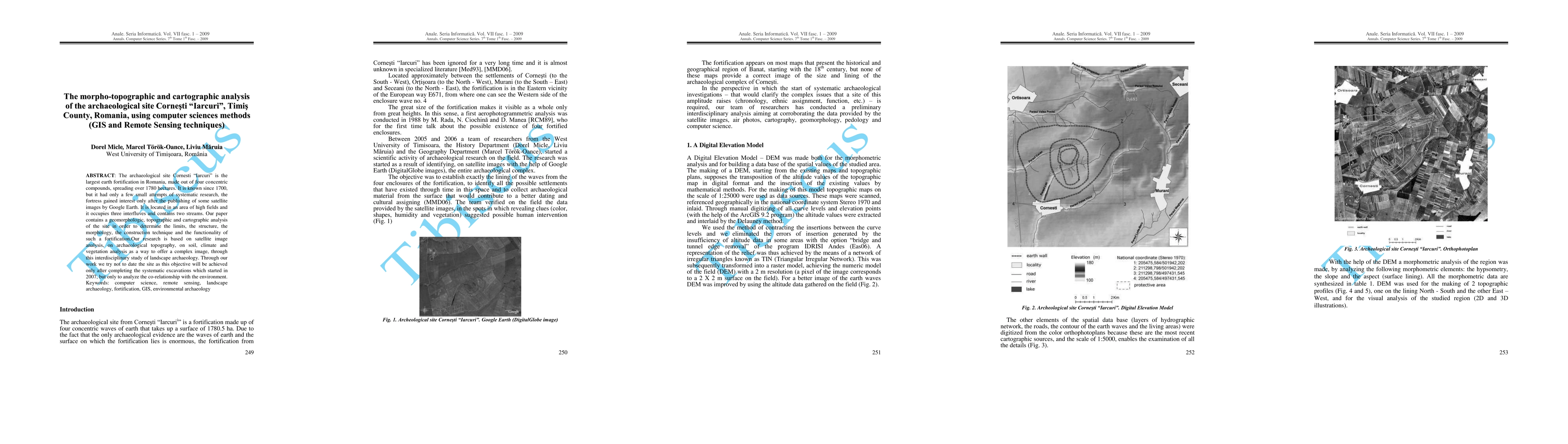 The archaeological site Cornesti "Iarcuri" is the largest earth fortification in Romania, made out of four concentric compounds, spreading over 1780 hectares. It is known since 1700, but it had only a few small attempts of systematic research, the fortress gained interest only after the publishing of some satellite images by Google Earth. It is located in an area of high fields and it occupies three interfluves and contains two streams. Our paper contains a geomorphologic, topographic and cartographic analysis of the site in order to determine the limits, the structure, the morphology, the construction technique and the functionality of such a fortification.Our research is based on satellite image analysis, on archaeological topography, on soil, climate and vegetation analysis as a way to offer a complex image, through this interdisciplinary study of landscape archaeology. Through our work we try not to date the site as this objective will be achieved only after completing the systematic excavations which started in 2007, but only to analyze the co-relationship with the environment.