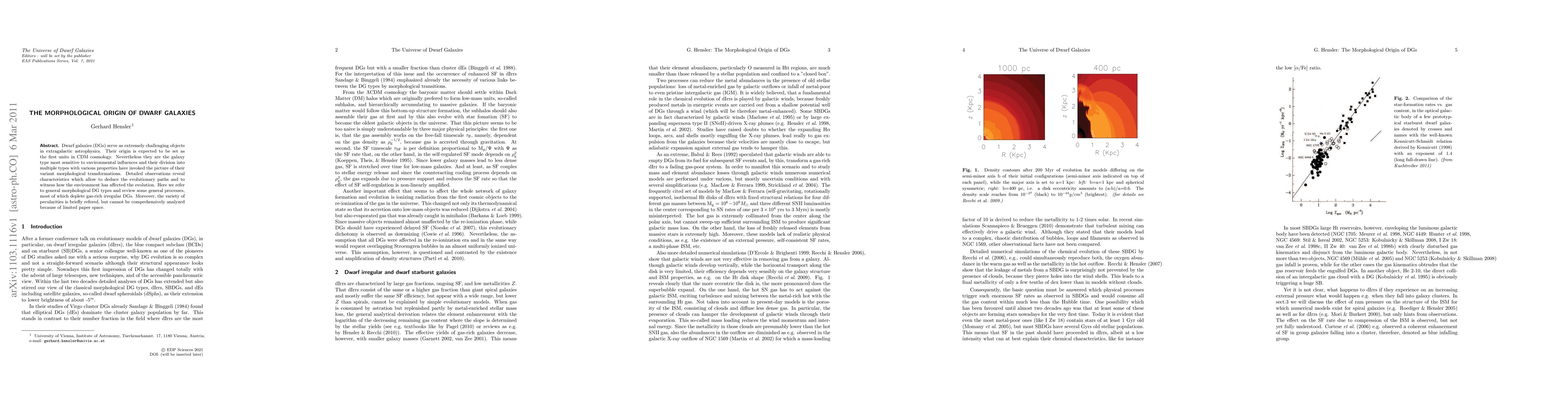 Dwarf galaxies (DGs) serve as extremely challenging objects in extragalactic astrophysics. Their origin is expected to be set as the first units in CDM cosmology. Nevertheless they are the galaxy type most sensitive to environmental in uences and their division into multiple types with various properties have invoked the picture of their variant morphological transformations. Detailed observations reveal characteristics which allow to deduce the evolutionary paths and to witness how the environment has affected the evolution. Here we refer to general morphological DG types and review some general processes, most of which deplete gas-rich irregular DGs. Moreover, the variety of pecularities is brie y refered, but cannot be comprehensively analyzed because of limited paper space.