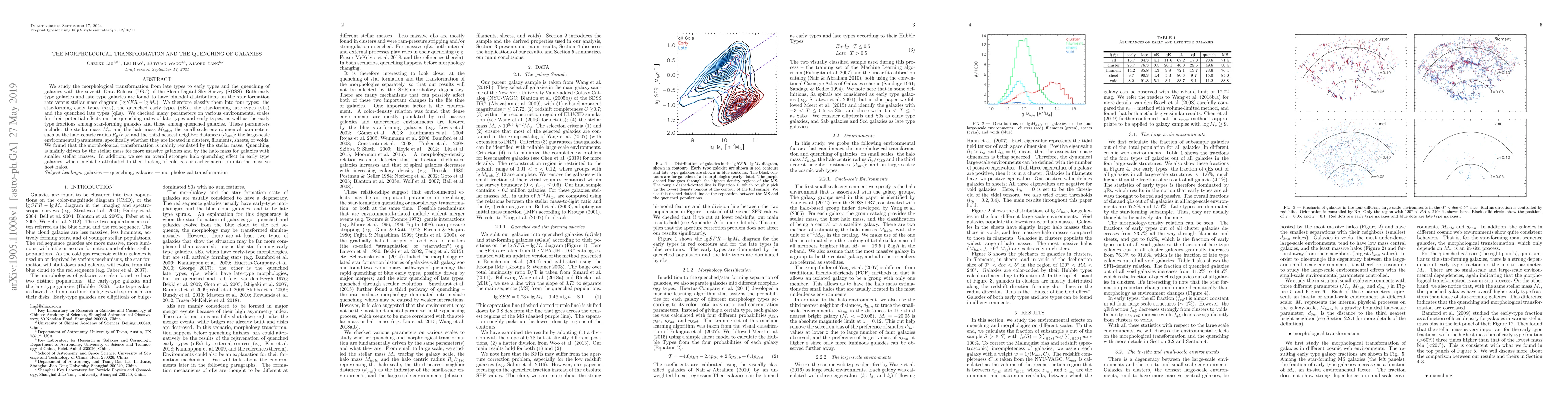 This paper investigates the morphological transformation from late to early types and the quenching of galaxies using SDSS DR7 data, classifying galaxies into four types based on star formation and stellar mass. It finds that morphological changes are primarily influenced by stellar mass, while quenching is driven by stellar mass for massive galaxies and halo mass for less massive ones, with early types showing a stronger halo quenching effect likely due to their lack of cold gas.