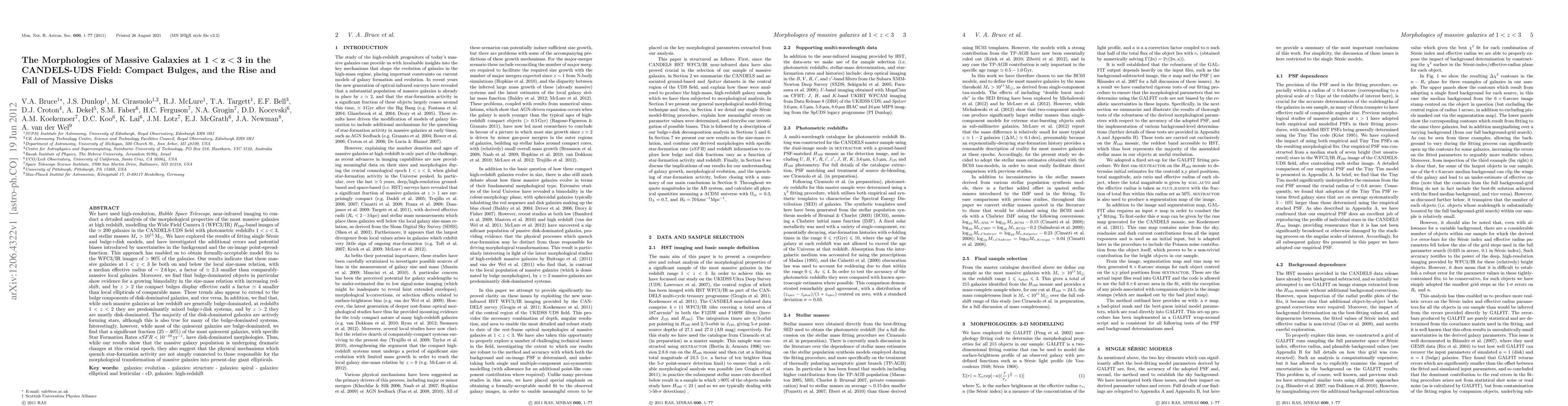 We have used deep, HST, near-IR imaging to study the morphological properties of the most massive galaxies at high z, modelling the WFC3/IR H-band images of the ~200 galaxies in the CANDELS-UDS field with 1 < z_phot < 3, and stellar masses M_star > 10^11 M_sun. We have used both single-Sersic and bulge+disk models, have investigated the errors/biases introduced by uncertainties in the background and the PSF, and have obtained formally-acceptable model fits to >90% of the galaxies. Our results indicate that these massive galaxies at 1 < z < 3 lie both on and below the local size-mass relation, with a median R_e~2.6 kpc, a factor of ~2.3 smaller than comparably-massive local galaxies. Moreover, we find that bulge-dominated objects in particular show evidence for a growing bimodality in the size-mass relation with increasing z, and by z > 2 the compact bulges display effective radii a factor ~4 smaller than local ellipticals of comparable mass. These trends appear to extend to the bulge components of disk-dominated galaxies, and vice versa. We also find that, while such massive galaxies at low z are bulge-dominated, at 1 < z < 2 they are predominantly mixed bulge+disk systems, and by z > 2 they are mostly disk-dominated. The majority of the disk-dominated galaxies are actively forming stars, but this is also true for many of the bulge-dominated systems. Interestingly, however, while most of the quiescent galaxies are bulge-dominated, we find that a significant fraction (25-40%) of the most quiescent galaxies have disk-dominated morphologies. Thus, while our results show that the massive galaxy population is undergoing dramatic changes at this crucial epoch, they also suggest that the physical mechanisms which quench star-formation activity are not simply connected to those responsible for the morphological transformation of massive galaxies into present-day giant ellipticals.