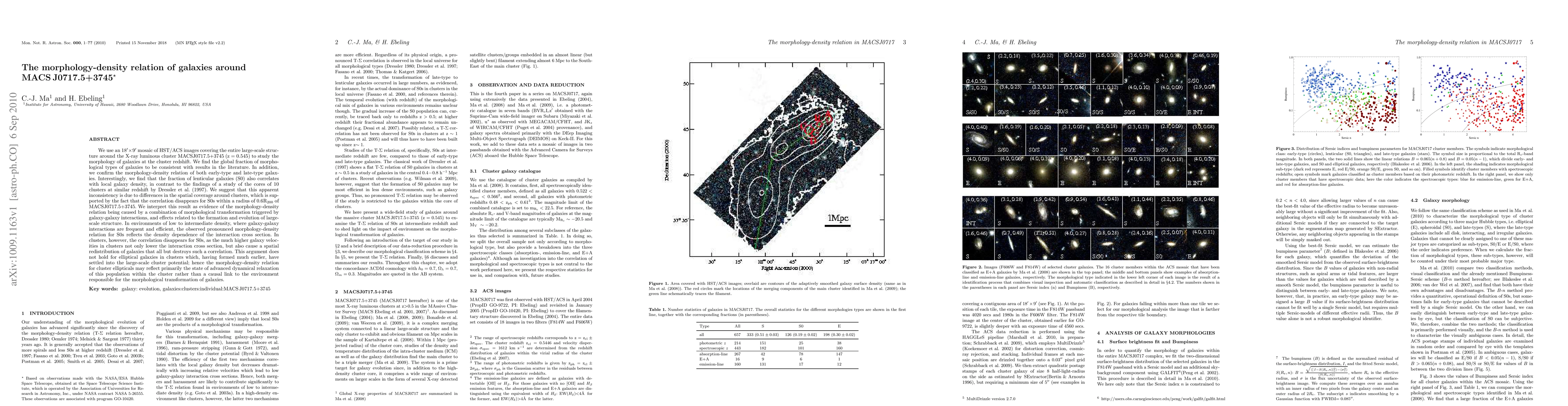 The study uses an 18' x 9' mosaic of ACS images covering the large-scale structure around the X-ray luminous cluster MACSJ0717.5+3745 (z=0.545) to analyze galaxy morphologies. Galaxies are classified into early types (E), spheroidals (S0), and late types (S), with sub-types categorized as E/S0 or S/S0 when ambiguous. Morphological parameters, including Sersic index (n) and Bumpiness (B), are derived using GALFIT.