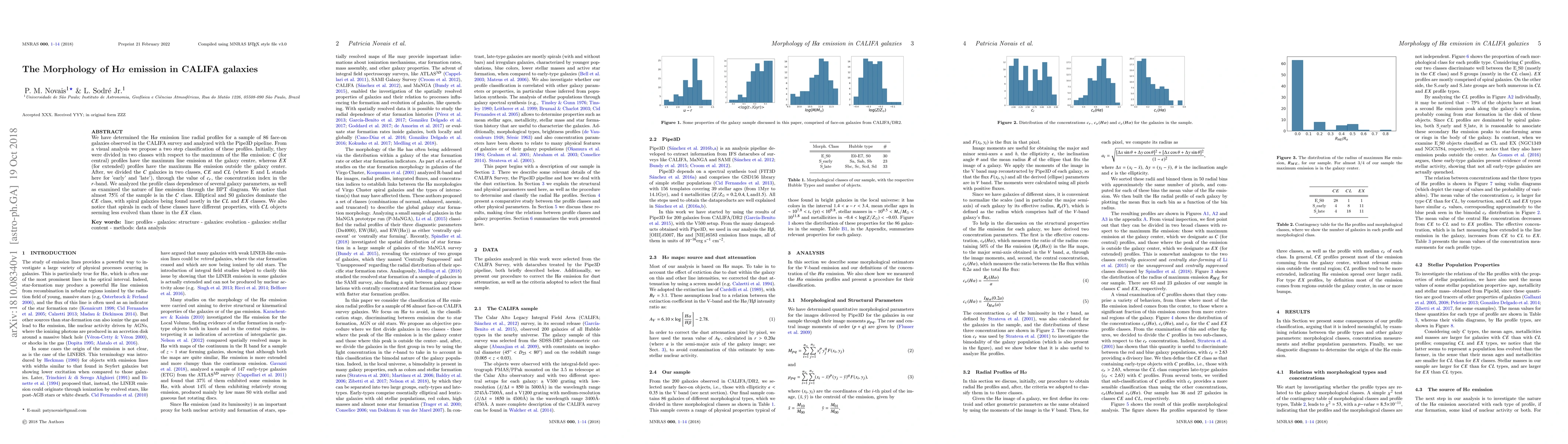 This study analyzes H{alpha} emission line radial profiles of 86 face-on galaxies from the CALIFA survey, classifying them into two initial categories based on the emission's centrality. Further division of central emission galaxies into 'early' and 'late' types reveals that elliptical and S0 galaxies dominate the 'early' type, while spiral galaxies are more prevalent in 'late' and 'extended' types. The research finds that spirals in each class have distinct properties, suggesting varying evolutionary stages, with 'late' central spirals appearing less evolved than 'extended' spirals.