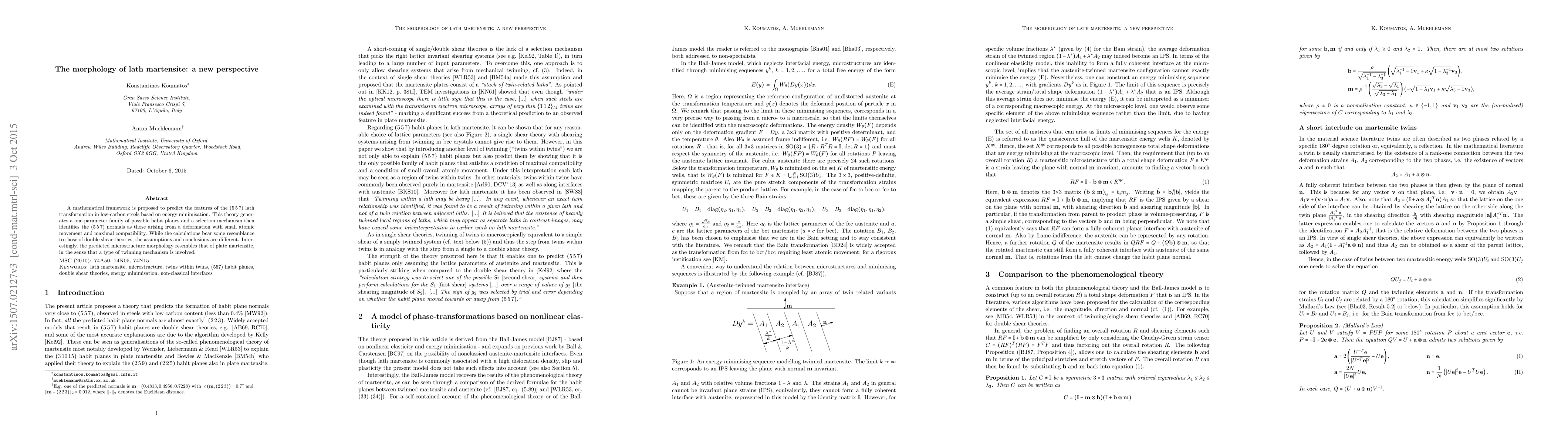 A mathematical framework is proposed to predict the features of the (5 5 7) lath transformation in low-carbon steels based on energy minimisation. This theory generates a one-parameter family of possible habit planes and a selection mechanism then identifies the (5 5 7) normals as those arising from a deformation with small atomic movement and maximal compatibility. While the calculations bear some resemblance to those of double shear theories, the assumptions and conclusions are different. Interestingly, the predicted microstructure morphology resembles that of plate martensite, in the sense that a type of twinning mechanism is involved.