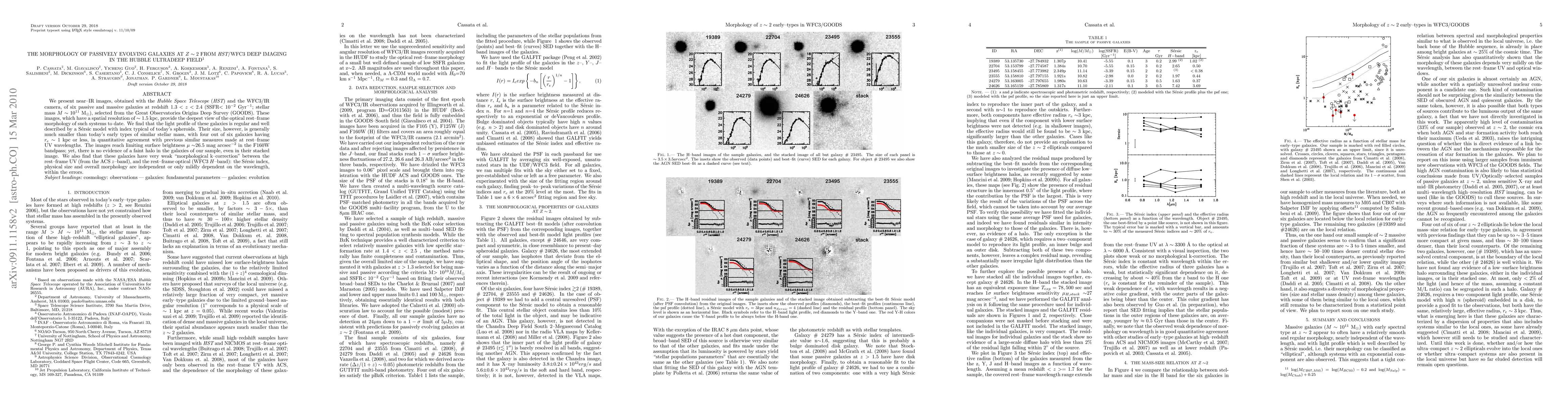 This study uses HST/WFC3 near-IR imaging to analyze the morphology of six passive, massive galaxies at redshifts 1.3<z<2.4, finding their light profiles fit well to a Sersic model typical of modern spheroids, though they are significantly smaller than today's similar galaxies. The galaxies show no evidence of a faint halo and have a weak morphological k-correction across rest-frame UV and optical wavelengths.