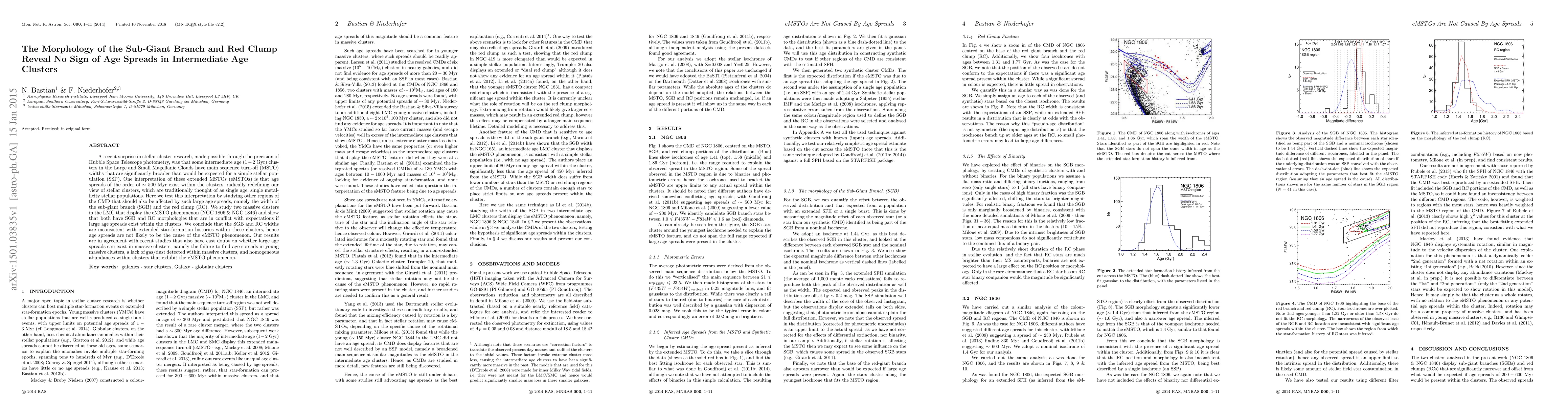 This paper investigates the morphology of the sub-giant branch and red clump in two massive clusters in the Large Magellanic Cloud, finding that their widths do not support the hypothesis of large age spreads within the clusters. The study concludes that the observed main sequence turn-off width anomaly is likely not due to age spreads, aligning with recent findings that question the existence of such age spreads in massive clusters.