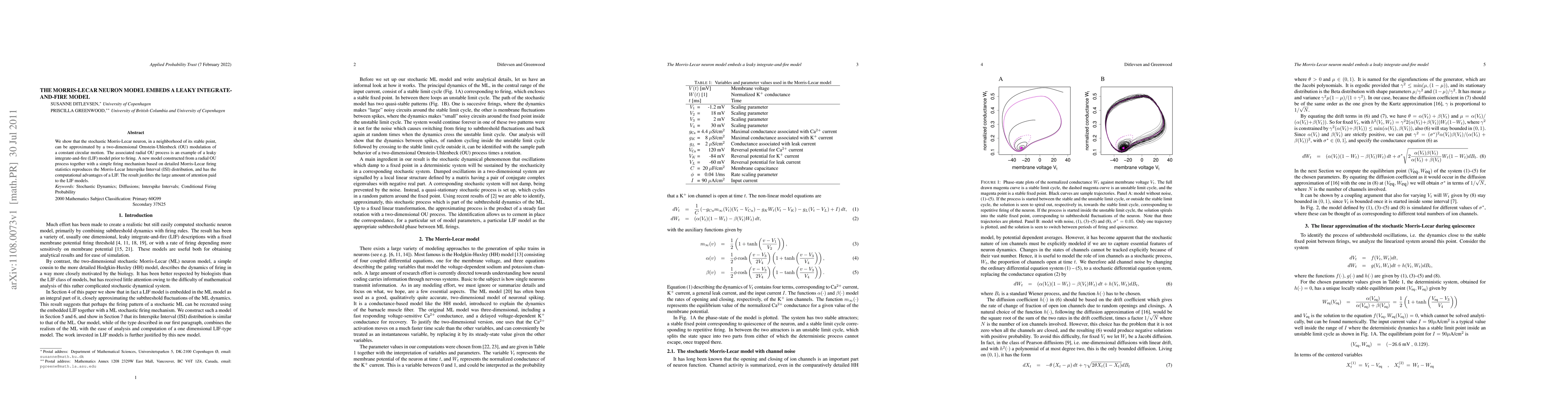 The Morris-Lecar neuron model can be approximated by a leaky integrate-and-fire model near its stable point, using a two-dimensional Ornstein-Uhlenbeck modulation. A new LIF model based on this approximation reproduces the Morris-Lecar Interspike Interval distribution and offers computational advantages.