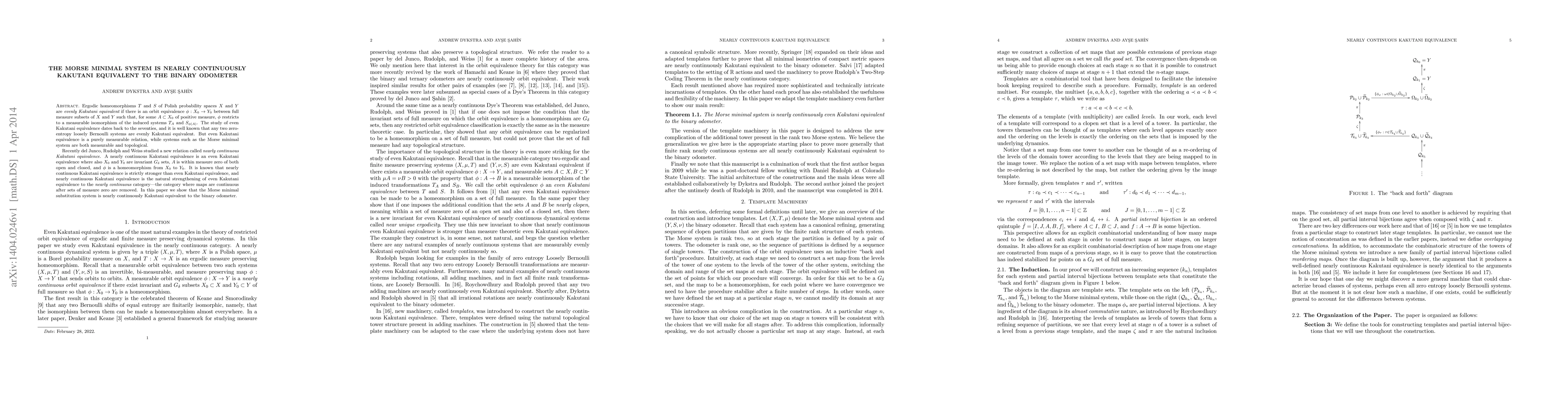Ergodic homeomorphisms $T$ and $S$ of Polish probability spaces $X$ and $Y$ are evenly Kakutani equivalent if there is an orbit equivalence $\phi: X_0 \rightarrow Y_0$ between full measure subsets of $X$ and $Y$ such that, for some $A \subset X_0$ of positive measure, $\phi$ restricts to a measurable isomorphism of the induced systems $T_A$ and $S_{\phi(A)}$. The study of even Kakutani equivalence dates back to the seventies, and it is well known that any two zero-entropy loosely Bernoulli systems are evenly Kakutani equivalent. But even Kakutani equivalence is a purely measurable relation, while systems such as the Morse minimal system are both measurable and topological. Recently del Junco, Rudolph and Weiss studied a new relation called nearly continuous Kakutani equivalence. A nearly continuous Kakutani equivalence is an even Kakutani equivalence where also $X_0$ and $Y_0$ are invariant $G_\delta$ sets, $A$ is within measure zero of both open and closed, and $\phi$ is a homeomorphism from $X_0$ to $Y_0$. It is known that nearly continuous Kakutani equivalence is strictly stronger than even Kakutani equivalence, and nearly continuous Kakutani equivalence is the natural strengthening of even Kakutani equivalence to the nearly continuous category---the category where maps are continuous after sets of measure zero are removed. In this paper we show that the Morse minimal substitution system is nearly continuously Kakutani equivalent to the binary odometer.