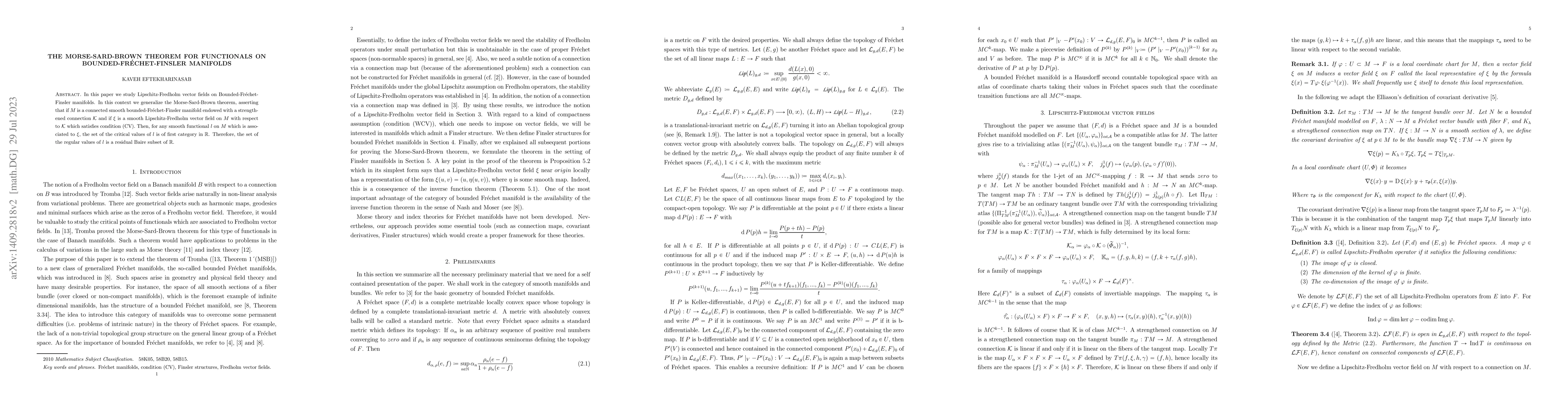 In this paper, we study Lipschitz-Fredholm vector fields on Bounded-Fr\'{e}chet-Finsler manifolds. In this context we generalize the Morse-Sard-Brown theorem, asserting that if $M$ is a connected smooth bounded-Fr\'{e}chet-Finsler manifold endowed with a strengthened connection $\mathcal{K}$ and if $\xi$ is a smooth Lipschitz-Fredholm vector field on $M$ with respect to $\mathcal{K}$ which satisfies condition (CV). Then, for any smooth functional $l$ on $M$ which is associated to $\xi$, the set of the critical values of $l$ is of the first category in $\rr$. Therefore, the set of the regular values of $l$ is a residual Baire subset of $\mathbb{R}$.