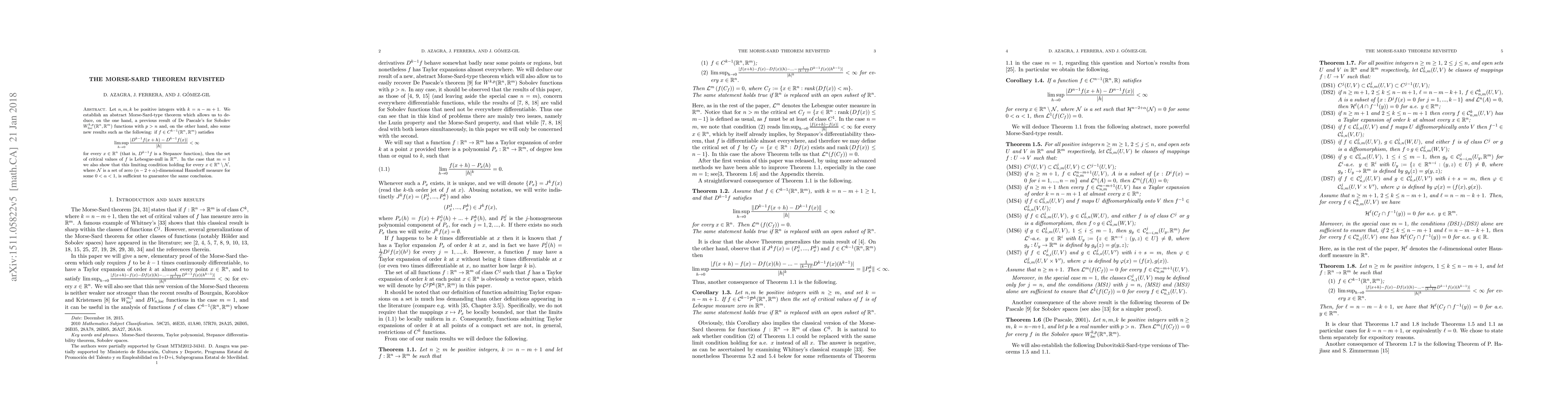 The paper establishes an abstract Morse-Sard-type theorem for Sobolev functions, extending De Pascale's results and proving that if a $C^{k-1}$ function satisfies a certain limiting condition, its critical values form a Lebesgue-null set. For $m=1$, it shows that a similar condition holds for a set of measure zero.