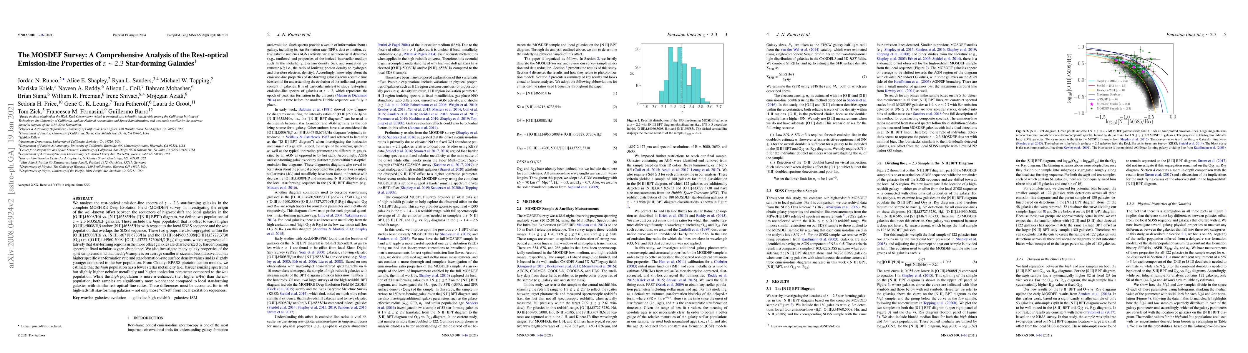 We analyze the rest-optical emission-line spectra of $z\sim2.3$ star-forming galaxies in the complete MOSFIRE Deep Evolution Field (MOSDEF) survey. In investigating the origin of the well-known offset between the sequences of high-redshift and local galaxies in the [O III]5008/H$\beta$ vs. [N II]6585/H$\alpha$ ("[N II] BPT") diagram, we define two populations of $z\sim2.3$ MOSDEF galaxies. These include the "high" population that is offset towards higher [O III]5008/H$\beta$ and/or [N II]6585/H$\alpha$ with respect to the local SDSS sequence and the "low" population that overlaps the SDSS sequence. These two groups are also segregated within the [O III]5008/H$\beta$ vs. [S II]6718,6733/H$\alpha$ and the [O III]4960,5008/[O II]3727,3730 (O$_{32}$) vs. ([O III]4960,5008+[O II]3727,3730)/H$\beta$ (R$_{23}$) diagram, which suggests qualitatively that star-forming regions in the more offset galaxies are characterized by harder ionizing spectra at fixed nebular oxygen abundance. We also investigate many galaxy properties of the split sample and find that the "high" sample is on average smaller in size and less massive, but has higher specific star-formation rate and star-formation-rate surface density values and is slightly younger compared to the "low" population. From Cloudy+BPASS photoionization models, we estimate that the "high" population has a lower stellar metallicity (i.e., harder ionizing spectrum) but slightly higher nebular metallicity and higher ionization parameter compared to the "low" population. While the "high" population is more $\alpha$-enhanced (i.e., higher $\alpha$/Fe) than the "low" population, both samples are significantly more $\alpha$-enhanced compared to local star-forming galaxies with similar rest-optical line ratios. These differences must be accounted for in all high-redshift star-forming galaxies -- not only those "offset" from local excitation sequences.