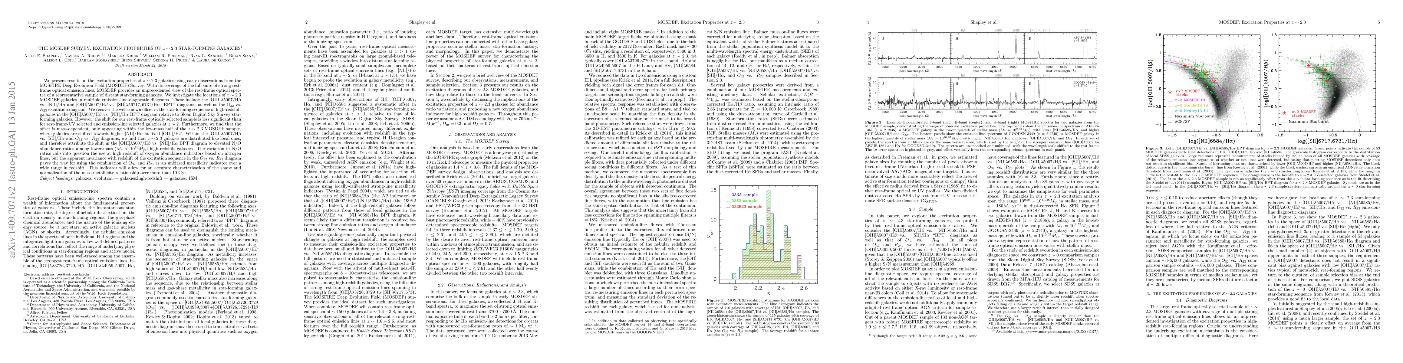 The MOSDEF survey presents an analysis of the excitation properties of $z\sim 2.3$ star-forming galaxies using rest-frame optical emission lines, covering a range of strong lines including Hβ, [OIII]λ5007, Hα, [NII]λ6584, [SII]λ6717, 6731, [OII]λλ3726, 3729. The study investigates the galaxies' positions in multiple diagnostic diagrams, such as [OIII]/Hβ vs. [NII]/Ha and [OIII]/Hβ vs. [SII]/Ha BPT diagrams, as well as the O_32 vs. R_23 excitation diagram.