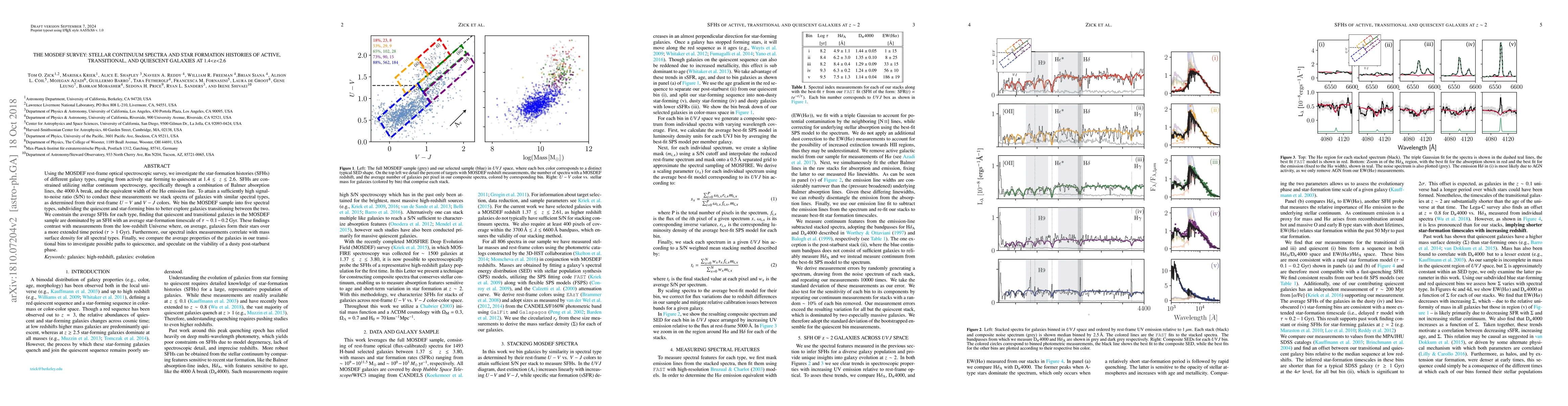 The MOSDEF Survey examines the star-formation histories of galaxies from active to quiescent types at redshifts 1.4 to 2.6, revealing that transitional and quiescent galaxies have shorter star-formation timescales compared to low-redshift galaxies. The study also finds a correlation between spectral index and mass surface density across different galaxy types.