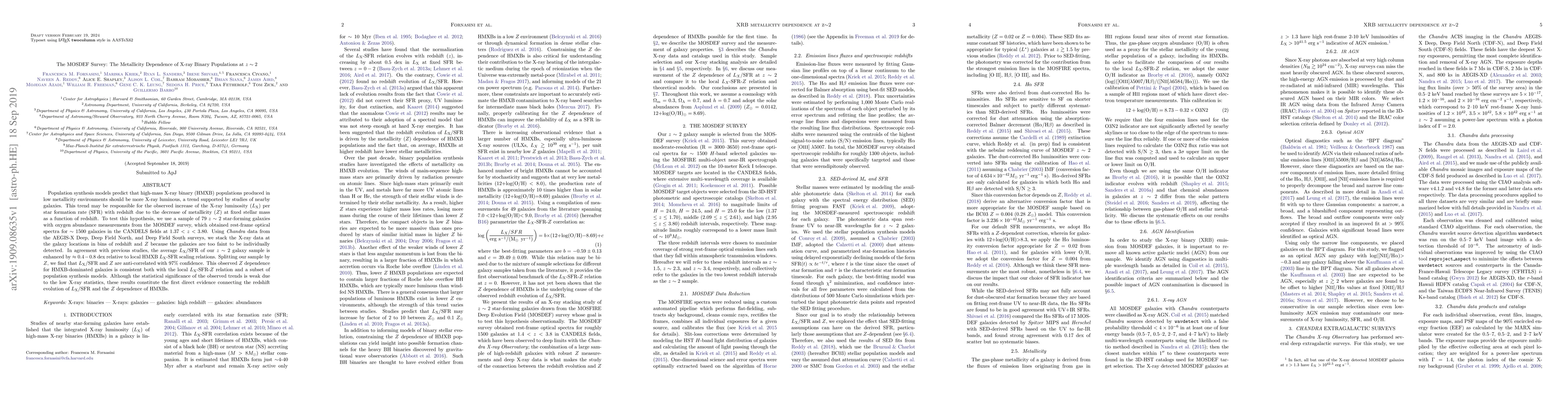 The MOSDEF Survey investigates the metallicity dependence of X-ray binary populations at $z\sim2$, revealing an anti-correlation between X-ray luminosity per star formation rate and metallicity. This supports the hypothesis that high-mass X-ray binaries in low metallicity environments are more luminous, contributing to the observed increase in X-ray luminosity per star formation rate with redshift.