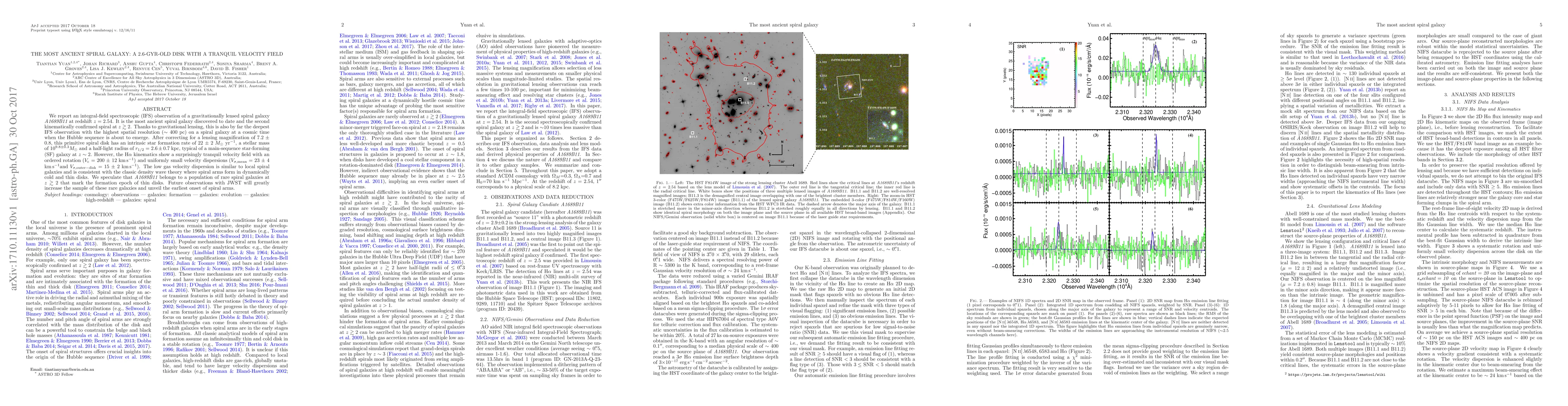 This paper reports the discovery of the most ancient spiral galaxy, A1689B11, at a redshift of $z=2.54$, characterized by a tranquil velocity field and ordered rotation. The galaxy's kinematics suggest a dynamically cold disk, consistent with early-stage spiral formation.