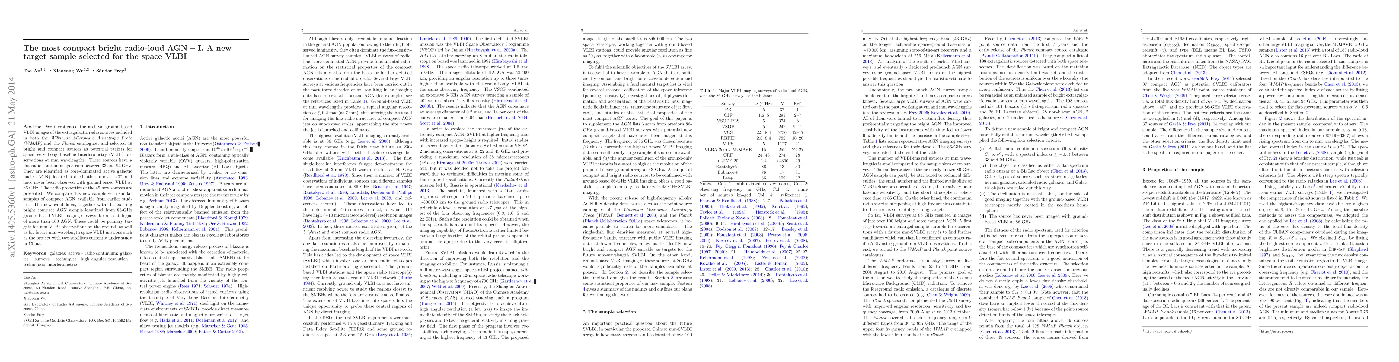 We investigated the archival ground-based VLBI images of the extragalactic radio sources included in both the {\it Wilkinson Microwave Anisotropy Probe (WMAP)} and the {\it Planck} catalogues, and selected 49 bright and compact sources as potential targets for space Very Long Baseline Interferometry (VLBI) observations at mm wavelengths. These sources have a flat radio continuum spectrum between 33 and 94~GHz. They are identified as core-dominated active galactic nuclei (AGN), located at declinations above $-40\degr$, and have never been observed with ground-based VLBI at 86~GHz. The radio properties of the 49 new sources are presented. We compare this new sample with similar samples of compact AGN available from earlier studies. The new candidates, together with the existing bright compact AGN sample identified from 86-GHz ground-based VLBI imaging surveys, form a catalogue of more than 160 AGN. These could be primary targets for mm-VLBI observations on the ground, as well as for future mm-wavelength space VLBI missions such as the project with two satellites currently under study in China.