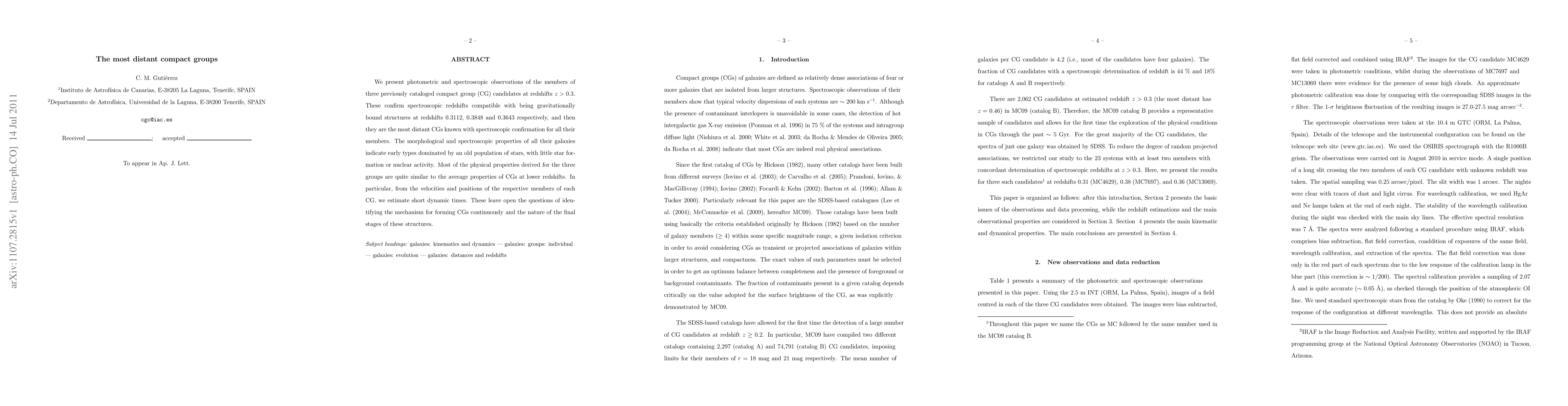 We present photometric and spectroscopic observations of the members of three previously cataloged compact group (CG) candidates at redshifts z>0.3. These confirm spectroscopic redshifts compatible with being gravitationally bound structures at redshifts 0.3112, 0.3848 and 0.3643 respectively, and then they are the most distant CGs known with spectroscopic confirmation for all their members. The morphological and spectroscopic properties of all their galaxies indicate early types dominated by an old population of stars, with little star formation or nuclear activity. Most of the physical properties derived for the three groups are quite similar to the average properties of CGs at lower redshifts. In particular, from the velocities and positions of the respective members of each CG, we estimate short dynamic times. These leave open the questions of identifying the mechanism for forming CGs continuously and the nature of the final stages of these structures.