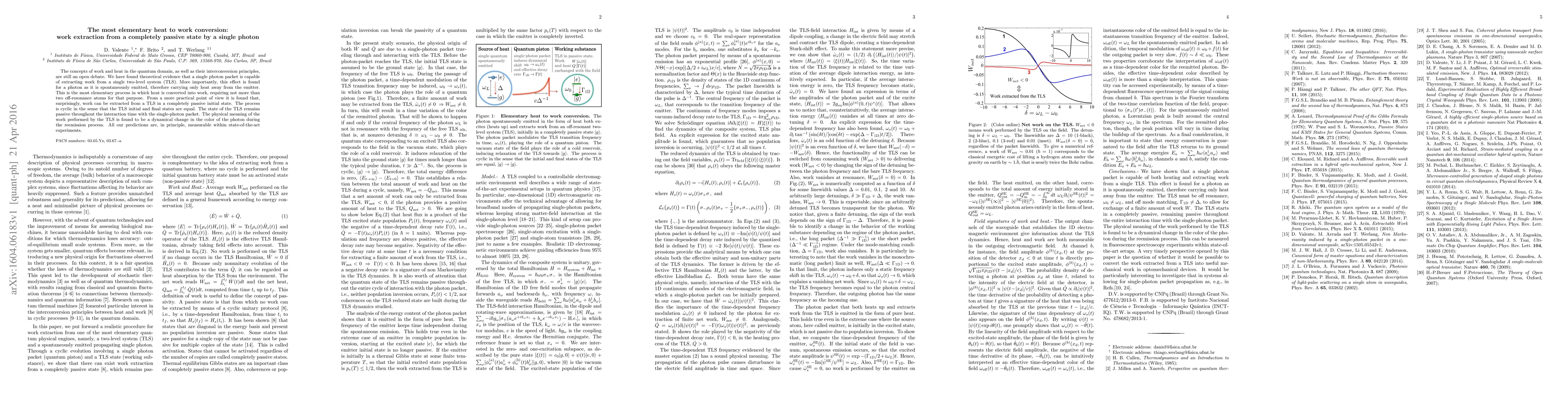 The concepts of work and heat in the quantum domain, as well as their interconversion principles, are still an open debate. We have found theoretical evidence that a single photon packet is capable of extracting work from a single two-level system (TLS). More importantly, this effect is found for a photon as it is spontaneously emitted, therefore carrying only heat away from the emitter. This is the most elementary process in which heat is converted into work, requiring not more than two off-resonance atoms for that purpose. From a more practical point of view it is found that, surprisingly, work can be extracted from a TLS in a completely passive initial state. The process is cyclic in the sense that the TLS initial and final states are equal. The state of the TLS remains passive throughout the interaction time with the single-photon packet. The physical meaning of the work performed by the TLS is found to be a dynamical change in the color of the photon during the reemission process. All our predictions are, in principle, measurable within state-of-the-art experiments.