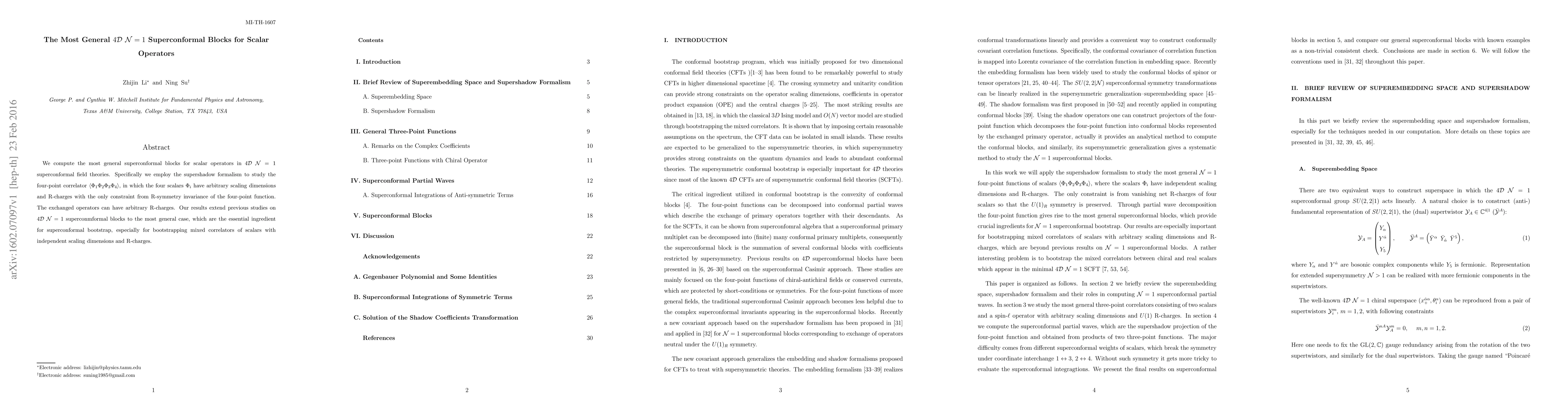 This paper computes the most general superconformal blocks for scalar operators in $4\mathcal{D}$ $\mathcal{N}=1$ superconformal field theories using the supershadow formalism, focusing on the four-point correlator $\langle\Phi_1 \Phi_2 \Phi_3 \Phi_4\rangle$ with arbitrary scaling dimensions and R-charges. These results extend previous studies and are crucial for the superconformal bootstrap, especially for correlators of scalars with diverse scaling dimensions and R-charges.