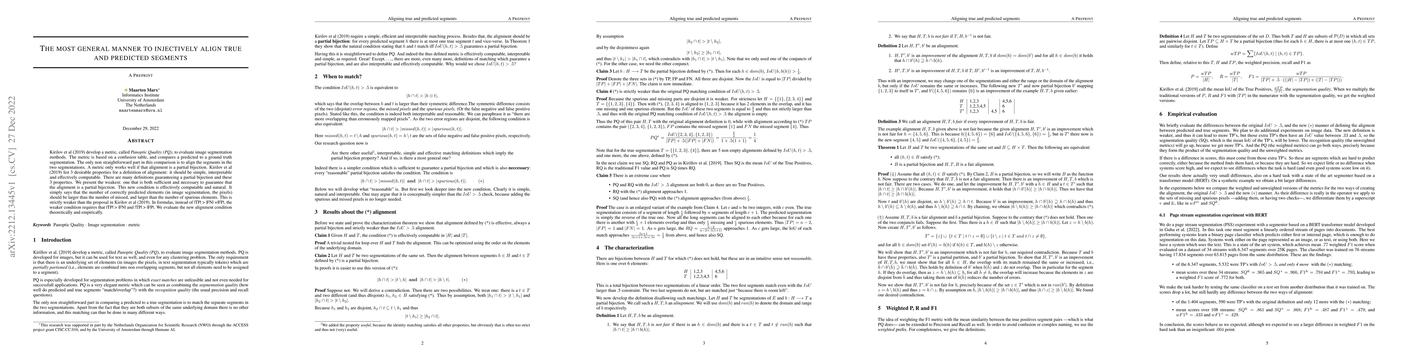 Kirilov et al. (2019) introduce a metric for evaluating image segmentation methods, but the alignment of predicted segments remains complex. The authors propose the simplest, interpretable, and computable alignment condition ensuring a partial bijection, requiring |TP| > |FN| and |TP| > |FP|, which is strictly weaker than previous proposals.