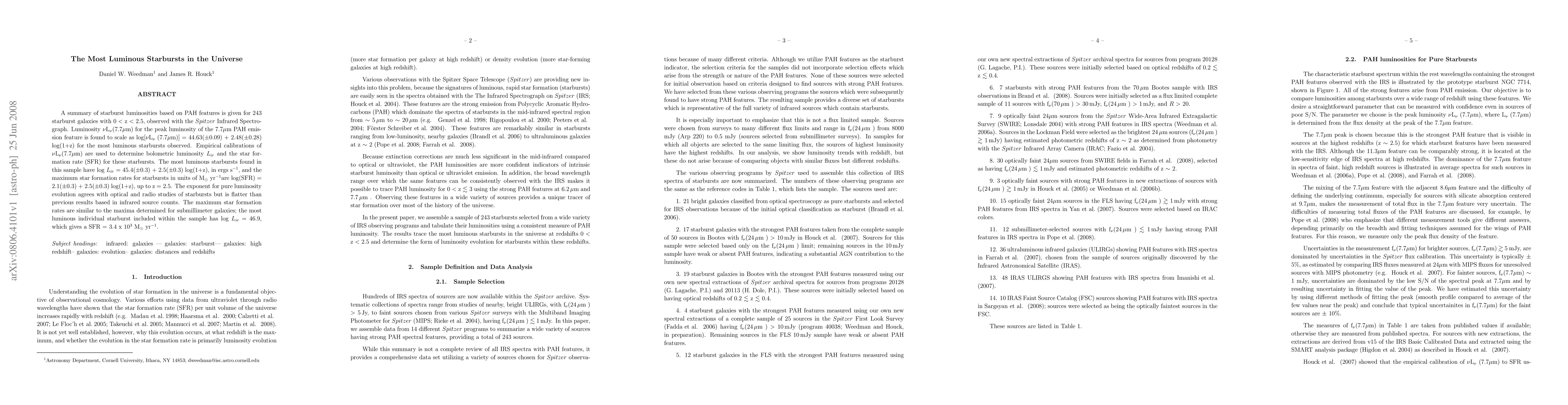 This study investigates the luminosities of 243 starburst galaxies using Spitzer observations, finding that the peak luminosity of the 7.7um PAH emission scales with redshift. The most luminous starbursts exhibit bolometric luminosities up to log Lir = 46.9 and star formation rates up to 3400 solar masses per year.