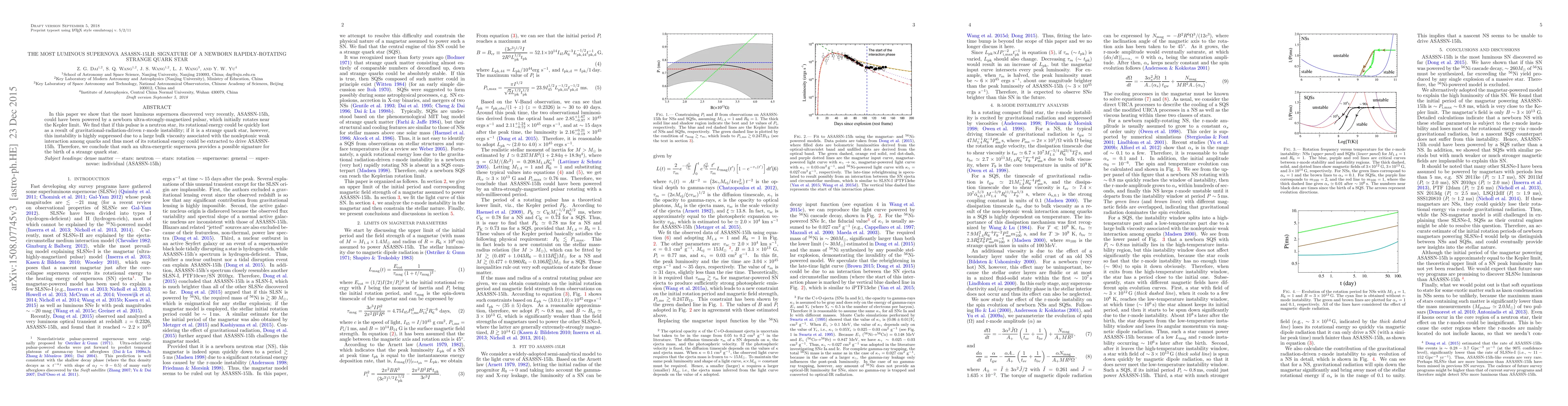 This paper proposes that the exceptionally luminous supernova ASASSN-15lh may have been powered by a newborn, rapidly-rotating strange quark star, rather than a neutron star, due to the suppression of gravitational-radiation-driven instabilities in the former. The findings suggest that the unique energy dynamics of a strange quark star could explain the supernova's extraordinary luminosity.