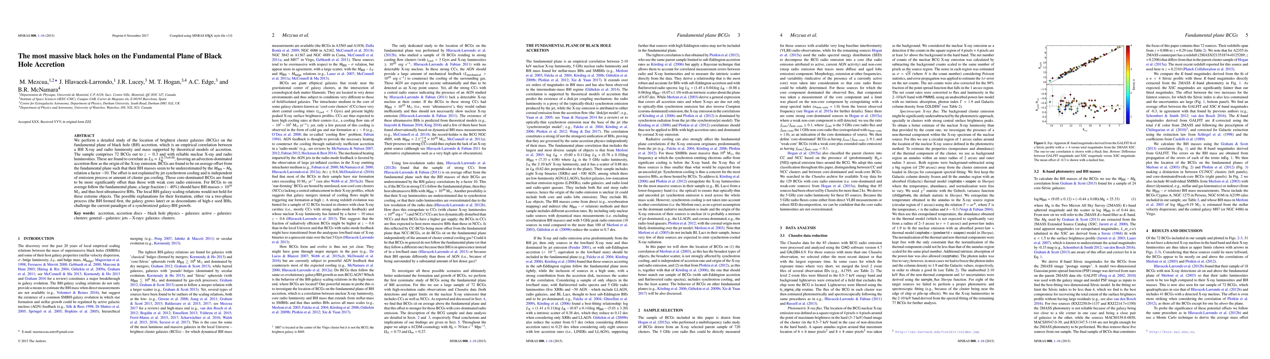 We perform a detailed study of the location of brightest cluster galaxies (BCGs) on the fundamental plane of black hole (BH) accretion, which is an empirical correlation between a BH X-ray and radio luminosity and mass supported by theoretical models of accretion. The sample comprises 72 BCGs out to $z\sim0.3$ and with reliable nuclear X-ray and radio luminosities. These are found to correlate as $L_\mathrm{X} \propto L_\mathrm{R}^{0.75 \pm 0.08}$, favoring an advection-dominated accretion flow as the origin of the X-ray emission. BCGs are found to be on average offset from the fundamental plane such that their BH masses seem to be underestimated by the $M_\mathrm{BH}-M_\mathrm{K}$ relation a factor $\sim$10. The offset is not explained by jet synchrotron cooling and is independent of emission process or amount of cluster gas cooling. Those core-dominated BCGs are found to be more significantly offset than those with weak core radio emission. For BCGs to on average follow the fundamental plane, a large fraction ($\sim40\%$) should have BH masses $> 10^{10}$ M$_{\odot}$ and thus host ultramassive BHs. The local BH-galaxy scaling relations would not hold for these extreme objects. The possible explanations for their formation, either via a two-phase process (the BH formed first, the galaxy grows later) or as descendants of high-z seed BHs, challenge the current paradigm of a synchronized galaxy-BH growth.