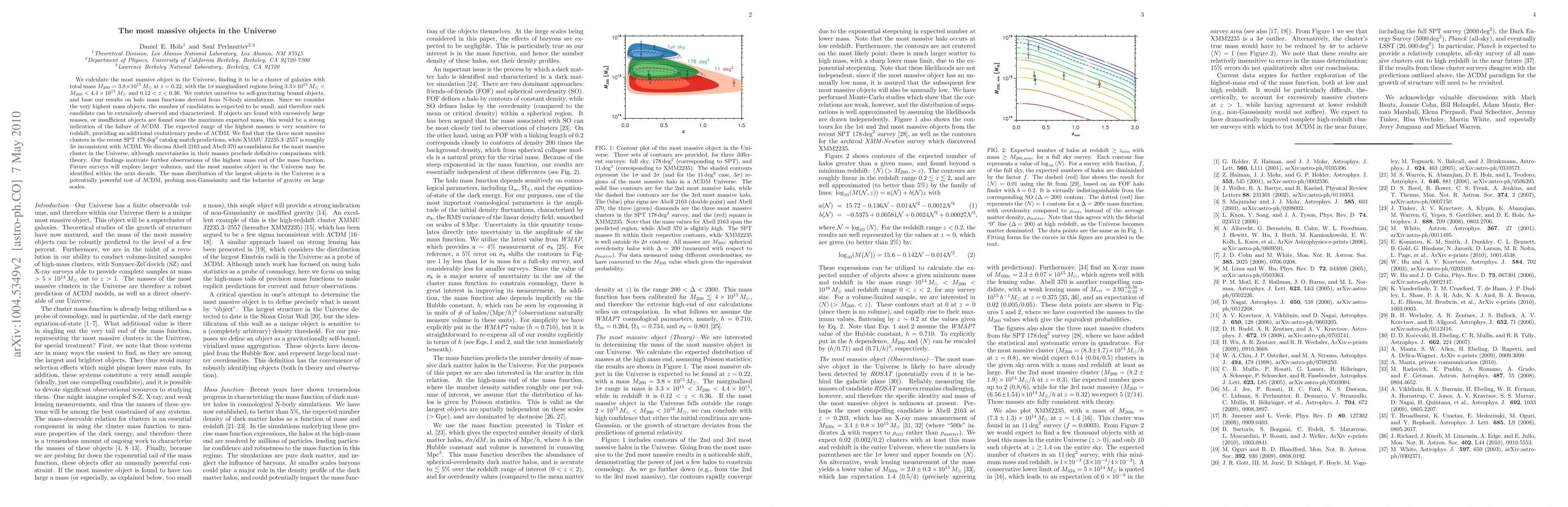 This paper identifies the most massive object in the Universe as a galaxy cluster with a total mass of 3.8e15 Msun, based on N-body simulations and halo mass functions. The study highlights the potential of these massive objects to test the LambdaCDM model, with future surveys expected to further identify the most massive cluster within the next decade.