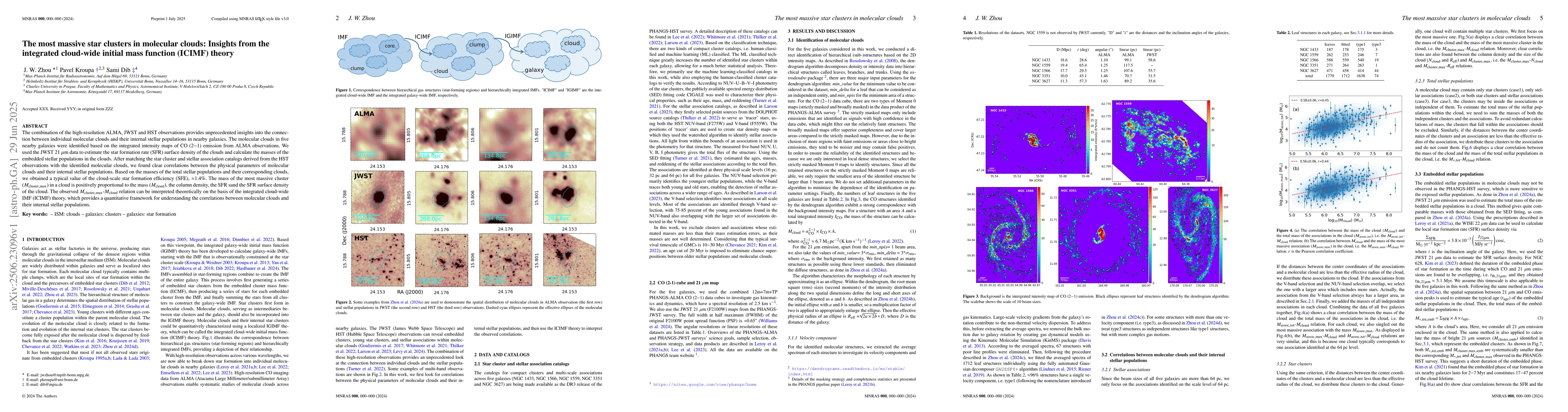 The combination of the high-resolution ALMA, JWST and HST observations provides unprecedented insights into the connection between individual molecular clouds and their internal stellar populations in nearby galaxies. The molecular clouds in five nearby galaxies were identified based on the integrated intensity maps of CO (2$-$1) emission from ALMA observations. We used the JWST 21 $\mu$m data to estimate the star formation rate (SFR) surface density of the clouds and calculate the masses of the embedded stellar populations in the clouds. After matching the star cluster and stellar association catalogs derived from the HST observations with the identified molecular clouds, we found clear correlations between the physical parameters of molecular clouds and their internal stellar populations. Based on the masses of the total stellar populations and their corresponding clouds, we obtained a typical value of the cloud-scale star formation efficiency (SFE), $\approx$1.4\%. The mass of the most massive cluster ($M_{\rm cluster, max}$) in a cloud is positively proportional to the mass ($M_{\rm cloud}$), the column density, the SFR sand the SFR surface density of the cloud. The observed $M_{\rm cluster, max}$-$M_{\rm cloud}$ relation can be interpreted theoretically on the basis of the integrated cloud-wide IMF (ICIMF) theory, which provides a quantitative framework for understanding the correlations between molecular clouds and their internal stellar populations.