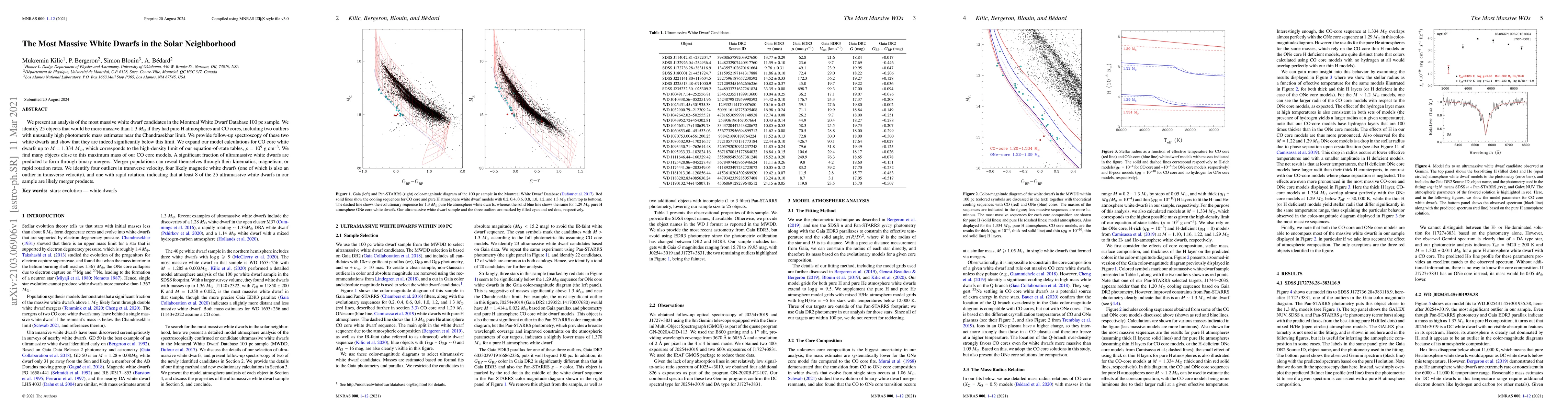 We present an analysis of the most massive white dwarf candidates in the Montreal White Dwarf Database 100 pc sample. We identify 25 objects that would be more massive than $1.3~M_{\odot}$ if they had pure H atmospheres and CO cores, including two outliers with unusually high photometric mass estimates near the Chandrasekhar limit. We provide follow-up spectroscopy of these two white dwarfs and show that they are indeed significantly below this limit. We expand our model calculations for CO core white dwarfs up to $M=1.334\ M_\odot$, which corresponds to the high-density limit of our equation-of-state tables, $\rho = 10^9$ g cm$^{-3}$. We find many objects close to this maximum mass of our CO core models. A significant fraction of ultramassive white dwarfs are predicted to form through binary mergers. Merger populations can reveal themselves through their kinematics, magnetism, or rapid rotation rates. We identify four outliers in transverse velocity, four likely magnetic white dwarfs (one of which is also an outlier in transverse velocity), and one with rapid rotation, indicating that at least 8 of the 25 ultramassive white dwarfs in our sample are likely merger products.
