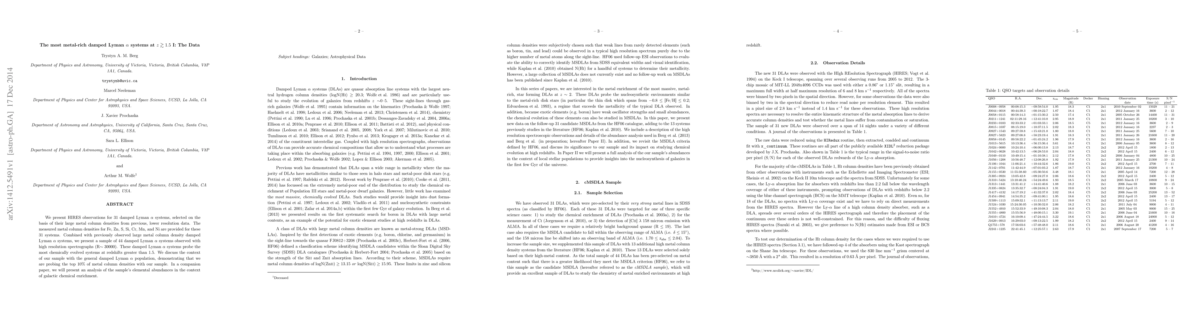 We present HIRES observations for 30 damped Lyman alpha systems, selected on the basis of their large metal column densities from previous, lower resolution data. The measured metal column densities for Fe, Zn, S, Si, Cr, Mn, and Ni are provided for these 30 systems. Combined with previously observed large metal column density damped Lyman alpha systems, we present a sample of 44 damped Lyman alpha systems observed with high resolution spectrographs (R~30000). These damped Lyman alpha systems probe the most chemically evolved systems at redshifts greater than 1.5. We discuss the context of our sample with the general damped Lyman alpha population, demonstrating that we are probing the top 10% of metal column densities with our sample. In a companion paper, we will present an analysis of the sample's elemental abundances in the context of galactic chemical enrichment.