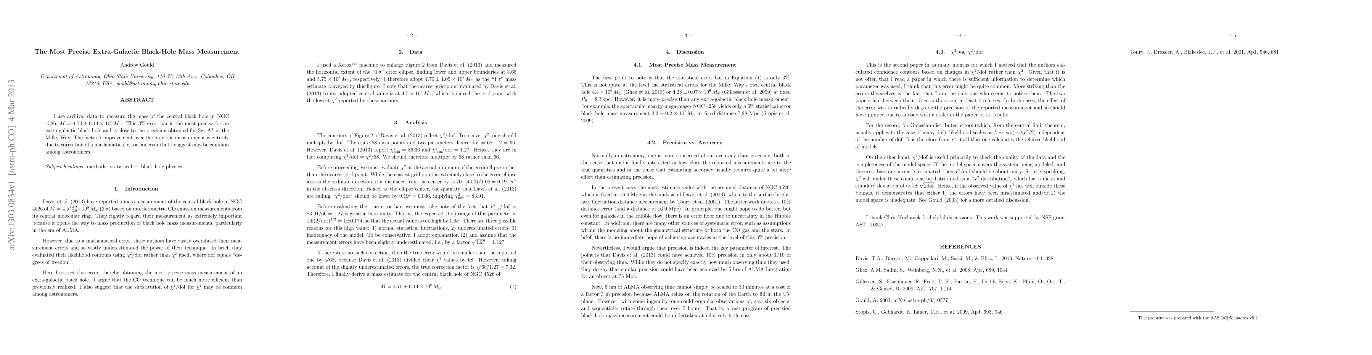 I use archival data to measure the mass of the central black hole in NGC 4526, M = (4.70 +- 0.14) X 10^8 Msun. This 3% error bar is the most precise for an extra-galactic black hole and is close to the precision obtained for Sgr A* in the Milky Way. The factor 7 improvement over the previous measurement is entirely due to correction of a mathematical error, an error that I suggest may be common among astronomers.
