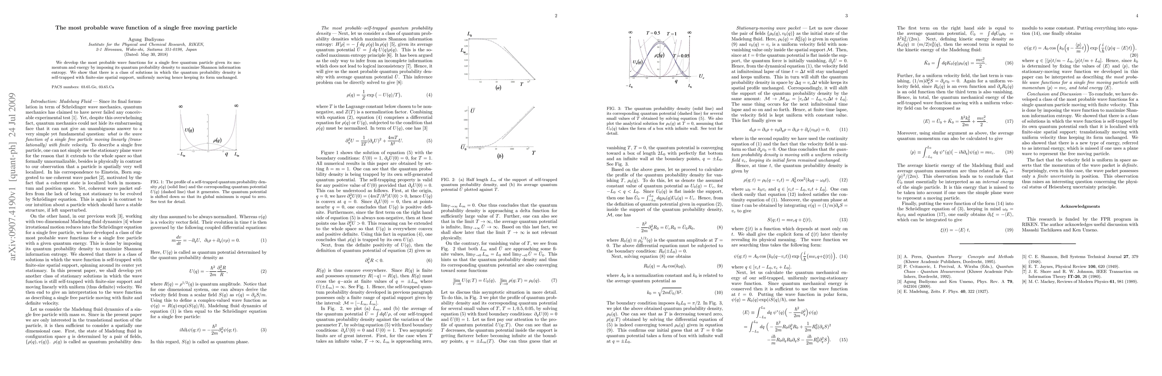 This paper develops the most probable wave functions for a free quantum particle based on maximizing Shannon information entropy, revealing a class of solutions with self-trapped, finite-size spatial support and uniform motion. These solutions maintain their form while moving.