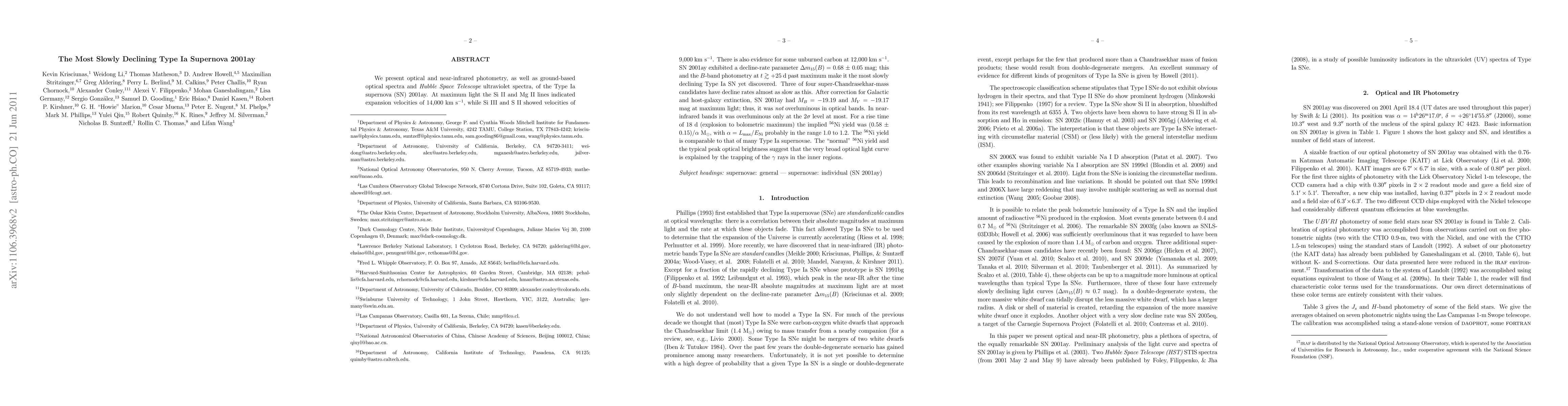 We present optical and near-infrared photometry, as well as ground-based optical spectra and Hubble Space Telescope ultraviolet spectra, of the Type Ia supernova (SN) 2001ay. At maximum light the Si II and Mg II lines indicated expansion velocities of 14,000 km/sec, while Si III and S II showed velocities of 9,000 km/sec There is also evidence for some unburned carbon at 12,000 km/sec. SN 2001ay exhibited a decline-rate parameter Delta m_15(B) = 0.68 \pm 0.05 mag; this and the B-band photometry at t > +25 d past maximum make it the most slowly declining Type Ia SN yet discovered. Three of four super-Chandrasekhar-mass candidates have decline rates almost as slow as this. After correction for Galactic and host-galaxy extinction, SN 2001ay had M_B = -19.19 and M_V = -19.17 mag at maximum light; thus, it was not overluminous in optical bands. In near-infrared bands it was overluminous only at the 2-sigma level at most. For a rise time of 18 d (explosion to bolometric maximum) the implied Ni-56 yield was (0.58 \pm 0.15)/alpha M_Sun, with alpha = L_max/E_Ni probably in the range 1.0 to 1.2. The Ni-56 yield is comparable to that of many Type Ia supernovae. The "normal" Ni-56 yield and the typical peak optical brightness suggest that the very broad optical light curve is explained by the trapping of the gamma rays in the inner regions.
