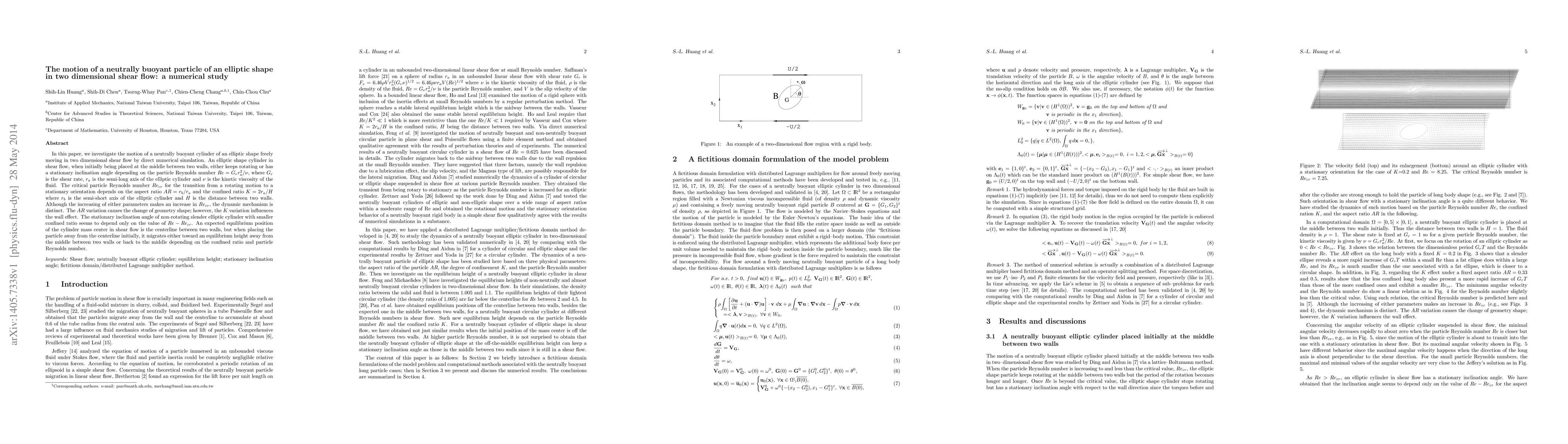 In this paper, we investigate the motion of a neutrally buoyant cylinder of an elliptic shape freely moving in two dimensional shear flow by direct numerical simulation. An elliptic shape cylinder in shear flow, when initially being placed at the middle between two walls, either keeps rotating or has a stationary inclination angle depending on the particle Reynolds number $Re=G_r r_a^2/\nu$, where $G_r$ is the shear rate, $r_a$ is the semi-long axis of the elliptic cylinder and $\nu$ is the kinetic viscosity of the fluid. The critical particle Reynolds number $Re_{cr}$ for the transition from a rotating motion to a stationary orientation depends on the aspect ratio $AR=r_b/r_a$ and the confined ratio $K=2r_a/H$ where $r_b$ is the semi-short axis of the elliptic cylinder and $H$ is the distance between two walls. Although the increasing of either parameters makes an increase in $Re_{cr}$, the dynamic mechanism is distinct. The $AR$ variation causes the change of geometry shape; however, the $K$ variation influences the wall effect. The stationary inclination angle of non-rotating slender elliptic cylinder with smaller confined ratio seems to depend only on the value of $Re-Re_{cr}$. An expected equilibrium position of the cylinder mass center in shear flow is the centerline between two walls, but when placing the particle away from the centerline initially, it migrates either toward an equilibrium height away from the middle between two walls or back to the middle depending on the confined ratio and particle Reynolds number.